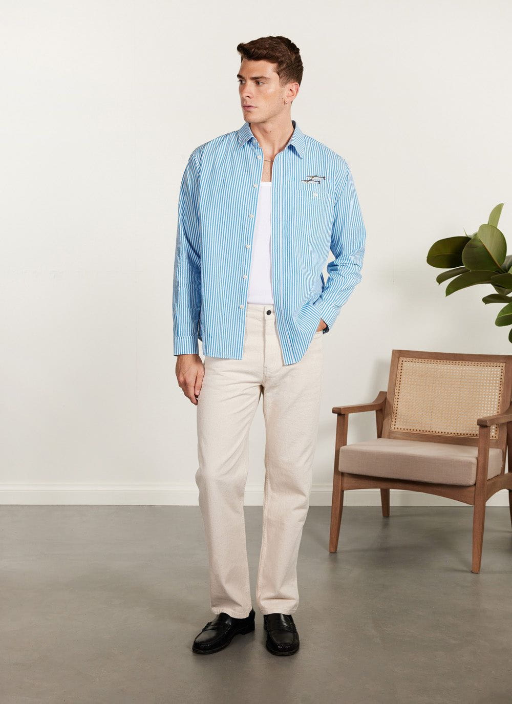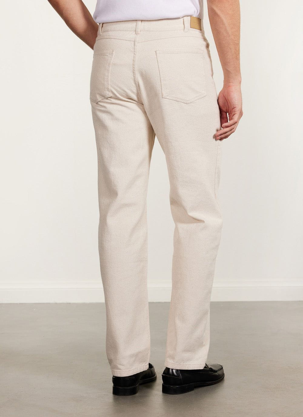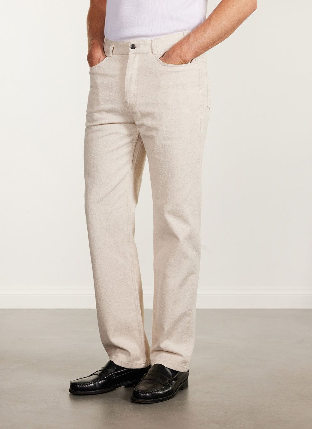 - Features: Men’s wide fit trousers made from twill cotton. With a button and zip fly, 5 pockets and in a regular rise, these cream trousers are ideal for every day wear and pair perfectly with an oversized tee.