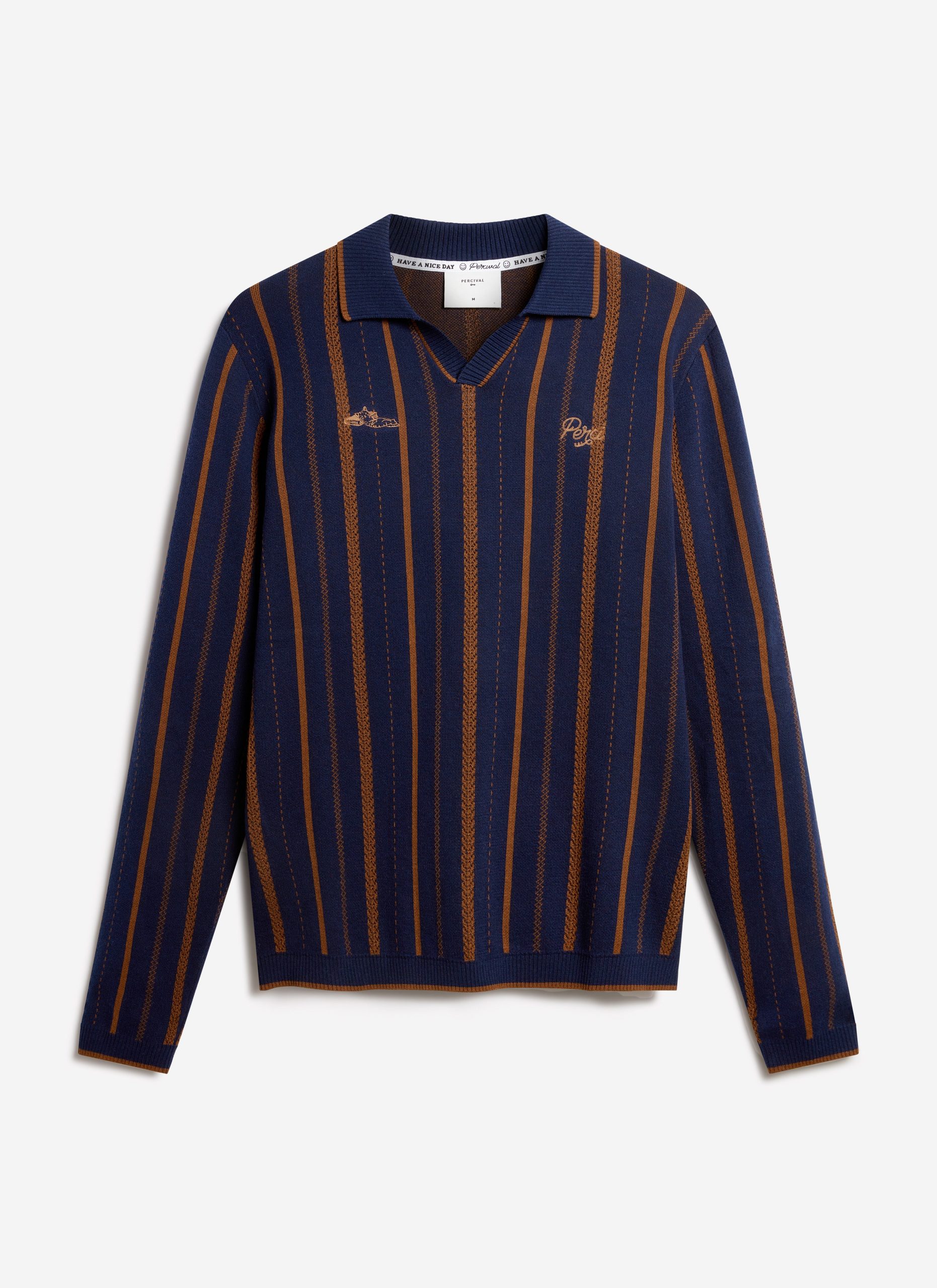 Men’s knitted football shirt with striped knit design, logo embroidery at chest, open placket with collar, ribbed cuff and hem.