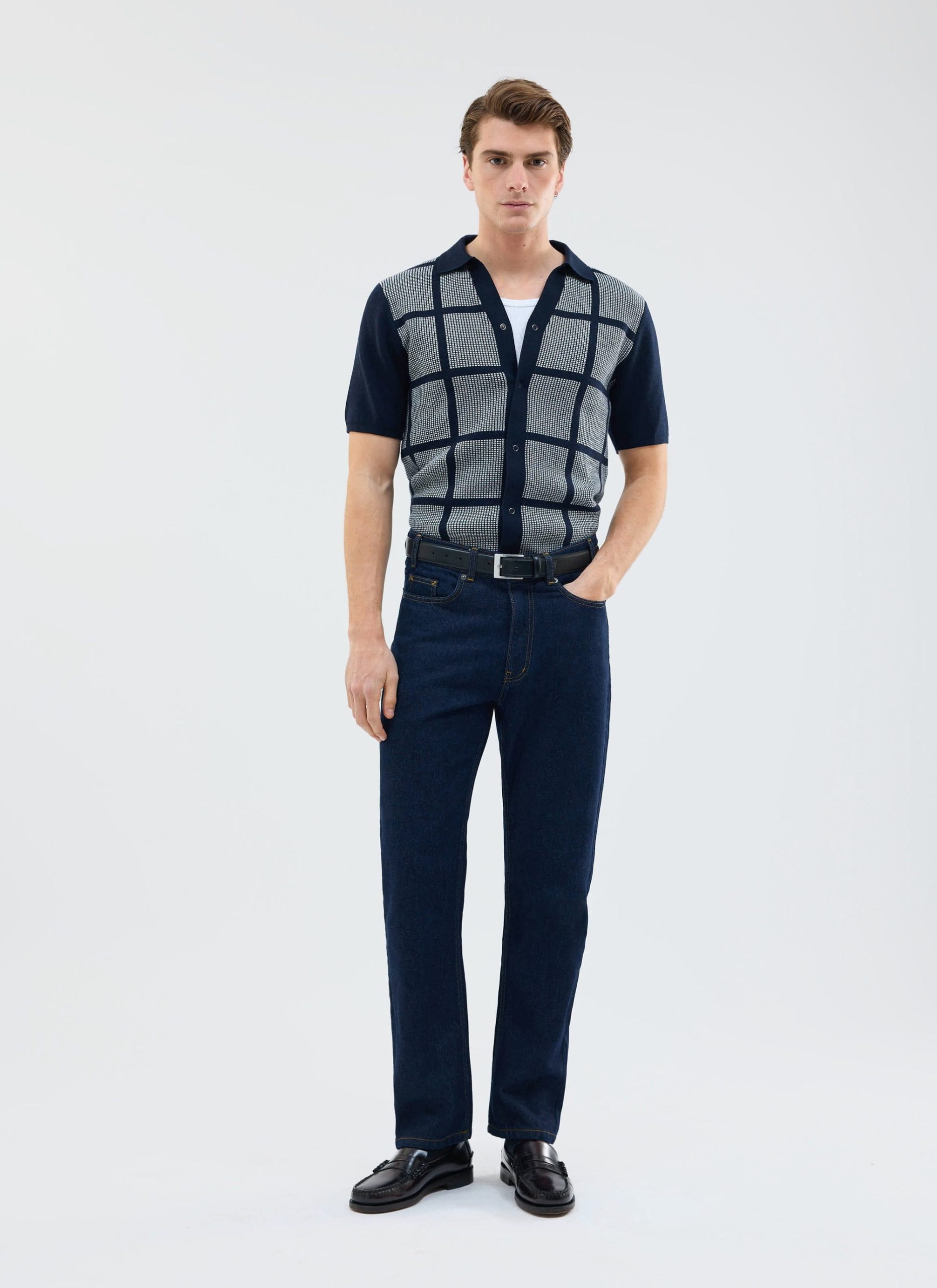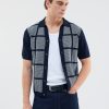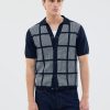 - Features: Men’s open collar knitted shirt, crafted from a breathable cotton and merino blend for all-day comfort. This navy bowling shirt features a retro inspired square design and stylish snap buttons, allowing it to be worn open or closed. It pairs effortlessly with Percival denim or suiting options, making it a smart-casual staple that’s perfect for summer.