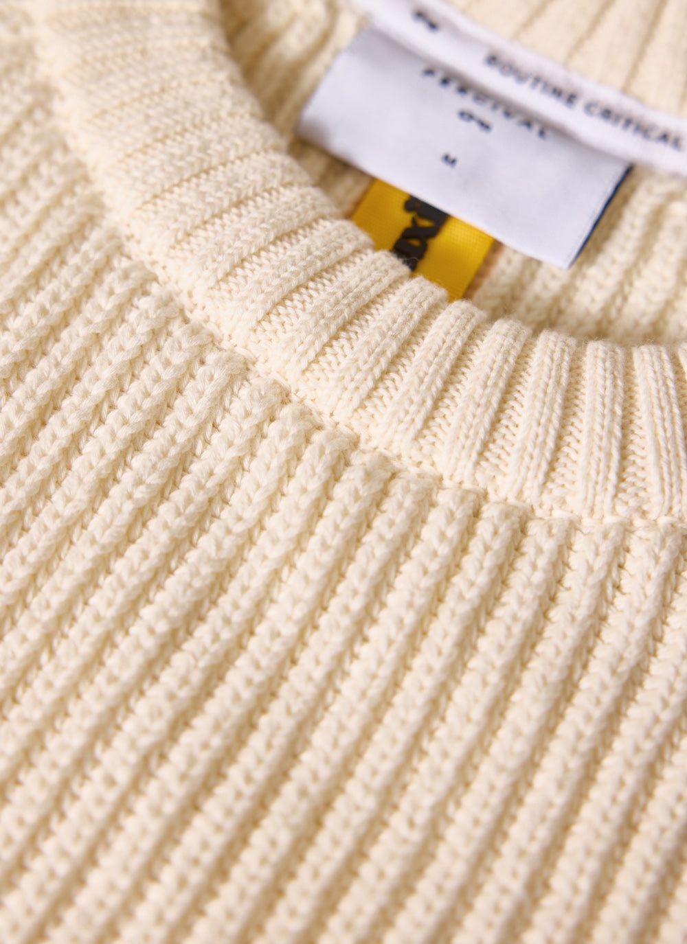 I dropped a stitch and needle a little help. Percival quality brand knitwear, good for the every day. Part of the building blocks of your wardrobe. This heavy weight quality cotton knit, knitted by the masters in Portugal. One colour for everyday of your work from home week.