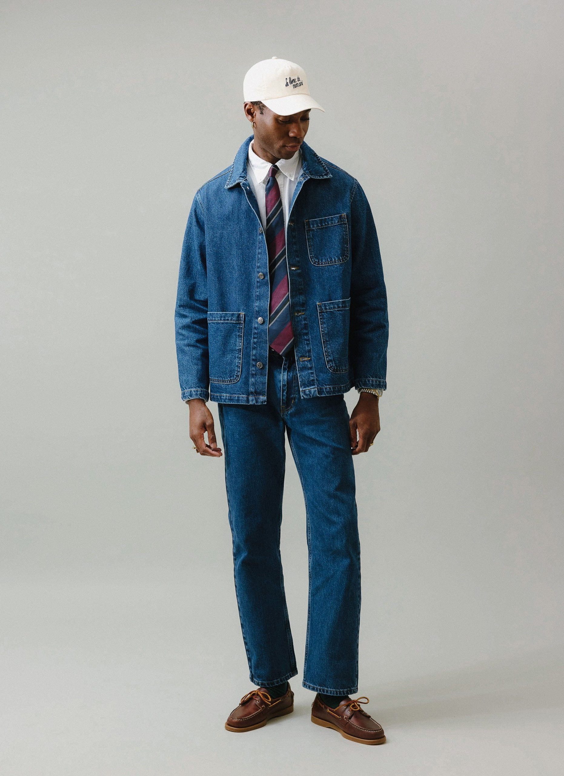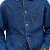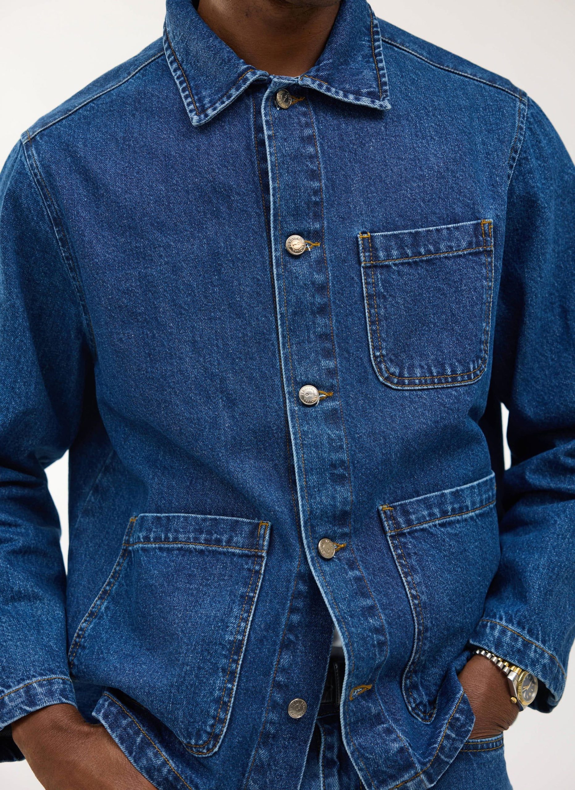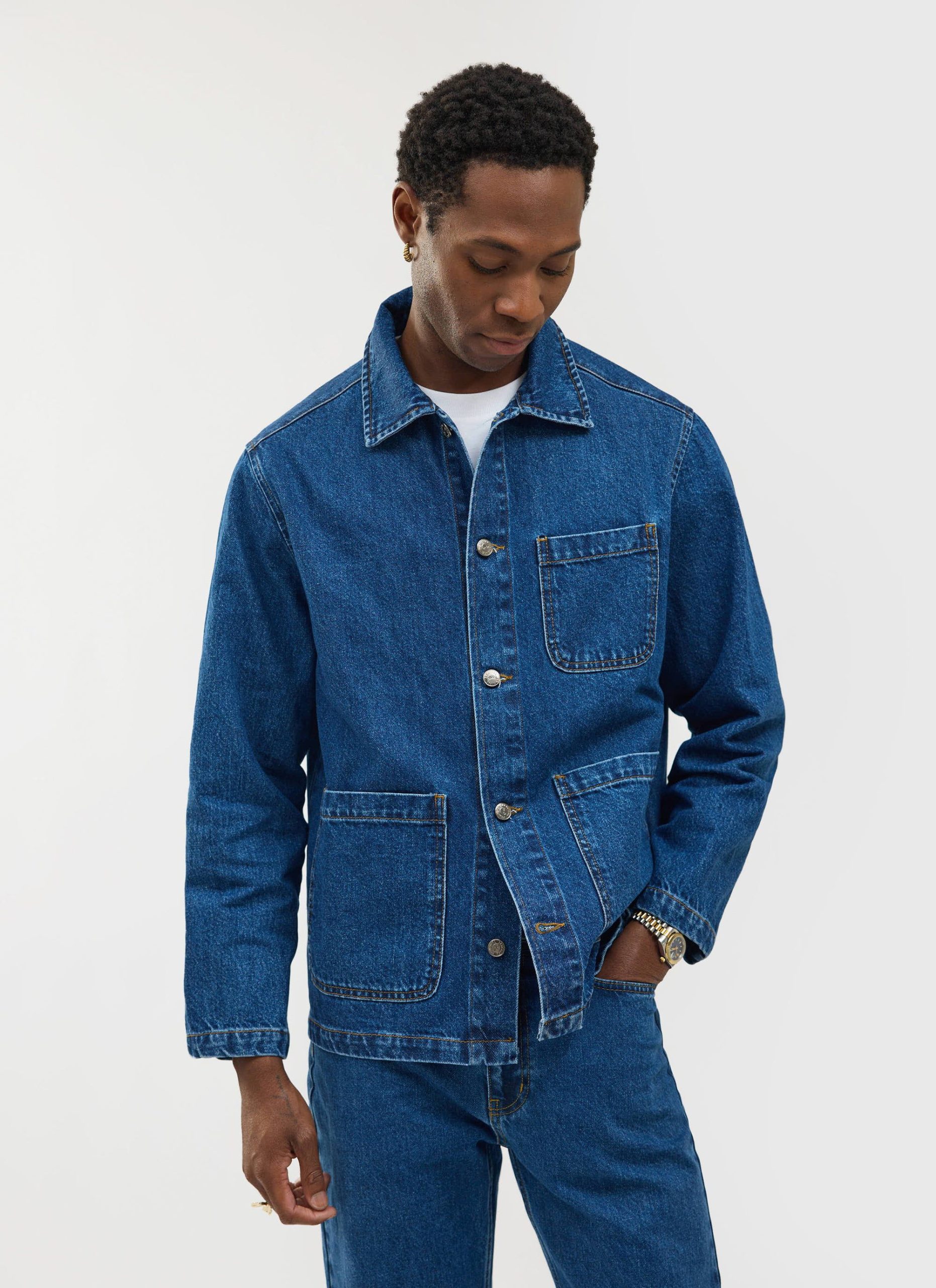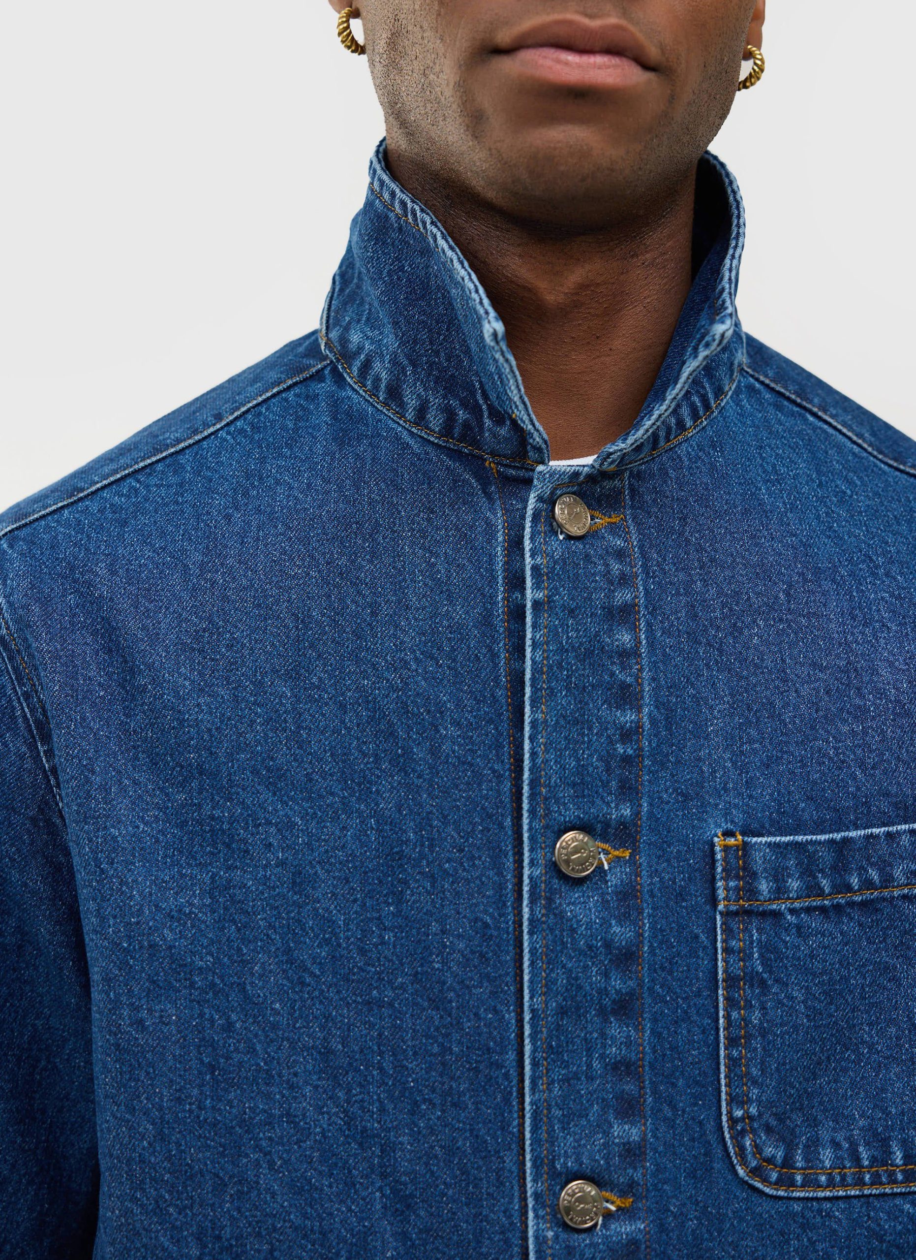 - Features: Men’s mid wash chore jacket blends utilitarian design with refined denim craftsmanship, offering a french workers jacket inspired look. Made from premium cotton denim and cut to a true-to-size fit, it features reinforced stitching, and clean lines throughout. Functional details include three front patch pockets, internal storage pockets, a full denim shank button closure, and tonal topstitching. Finished with a classic collar and subtle perci branding, the mid wash and workwear heritage make it a timeless layering staple, perfect over tees or styled with matching denim for a coordinated look.
