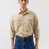 - Features: Men’s Long Sleeve Utility Shirt in Beige, as part of the . This regular fit shirt is made from a premium wool blend, offering a refined take on classic safari styling. Featuring two chest pockets, a sharp point collar, easily foldable sleeves, and subtle tonal stitching, it delivers a smart update to vintage American workwear. A versatile piece for layering or standalone wear across seasons.