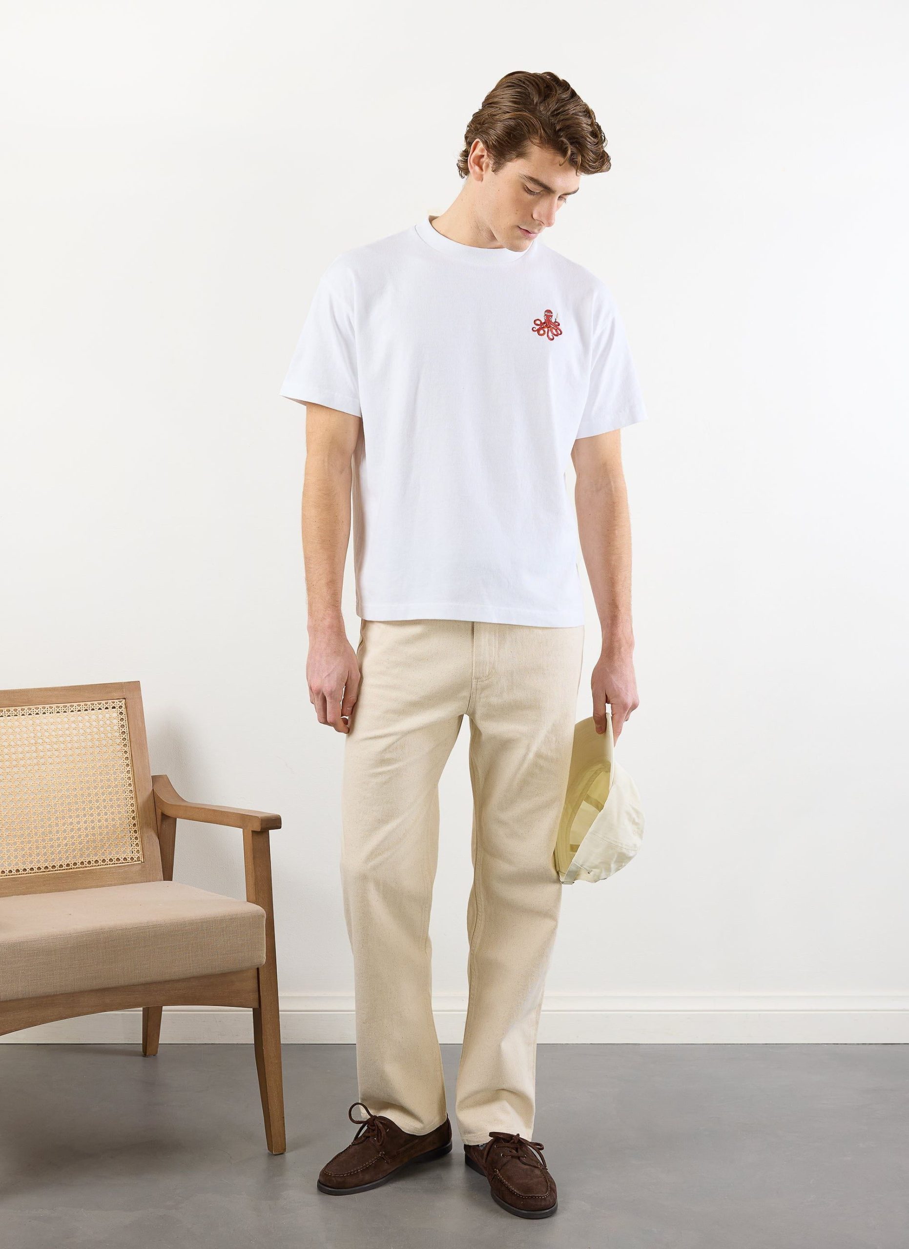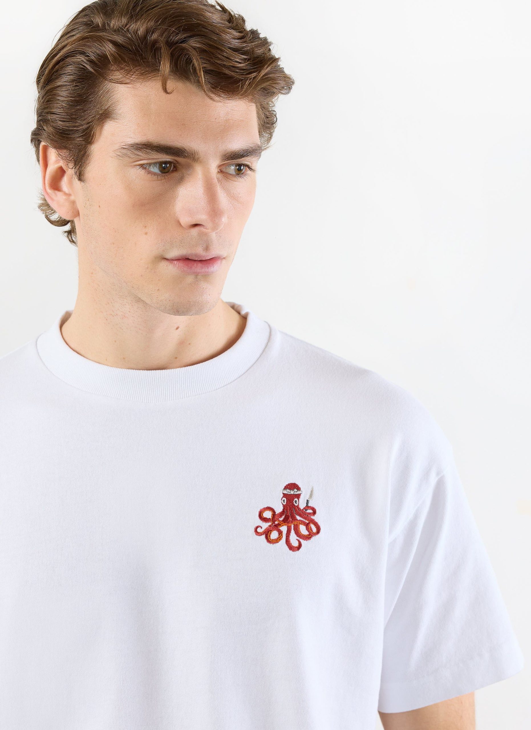 A white t-shirt with an embroidered octopus sushi chef on the front and a screen-printed design on the back—because nothing says “culinary mastery” like a a chef with eight arms and zero stress.