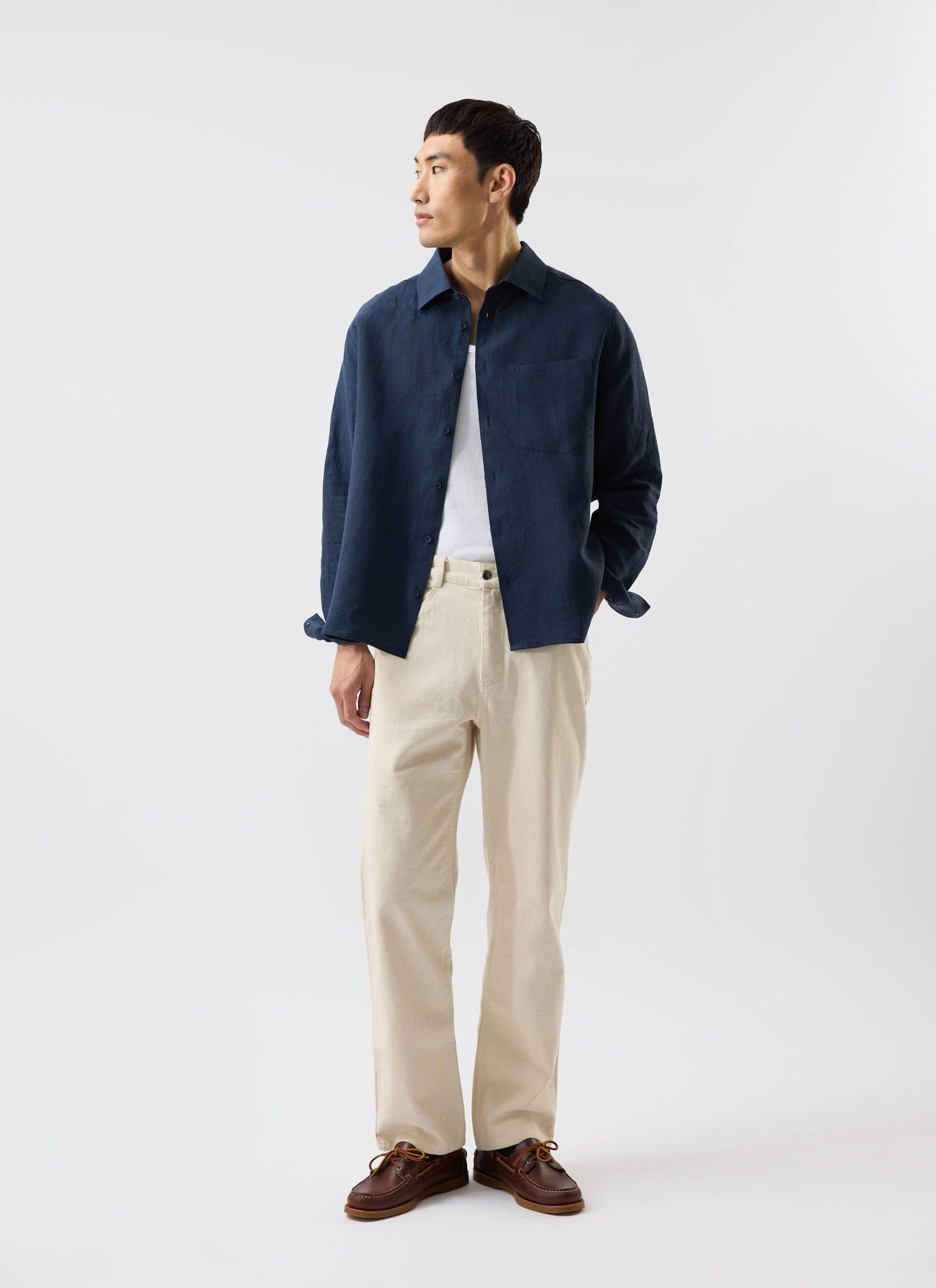 - Features: Men’s Long Sleeve Shirt in Navy. Featuring a famous linen feel, chest pocket and traditional point collar for a sophisticated look. Made from 100% linen for a breathable and light feel, this shirt is perfect for all a smart casual outfit or can be used for layering.