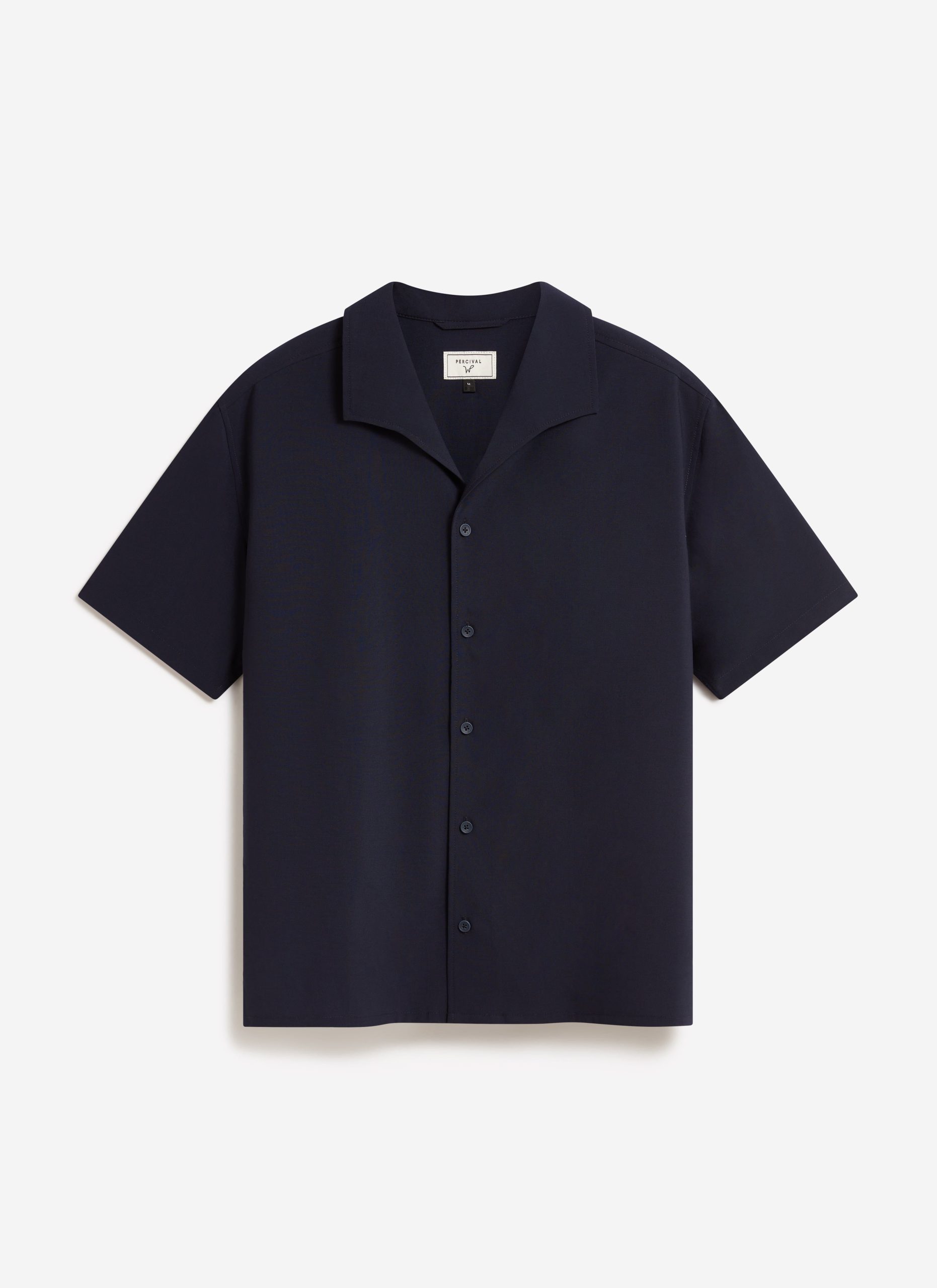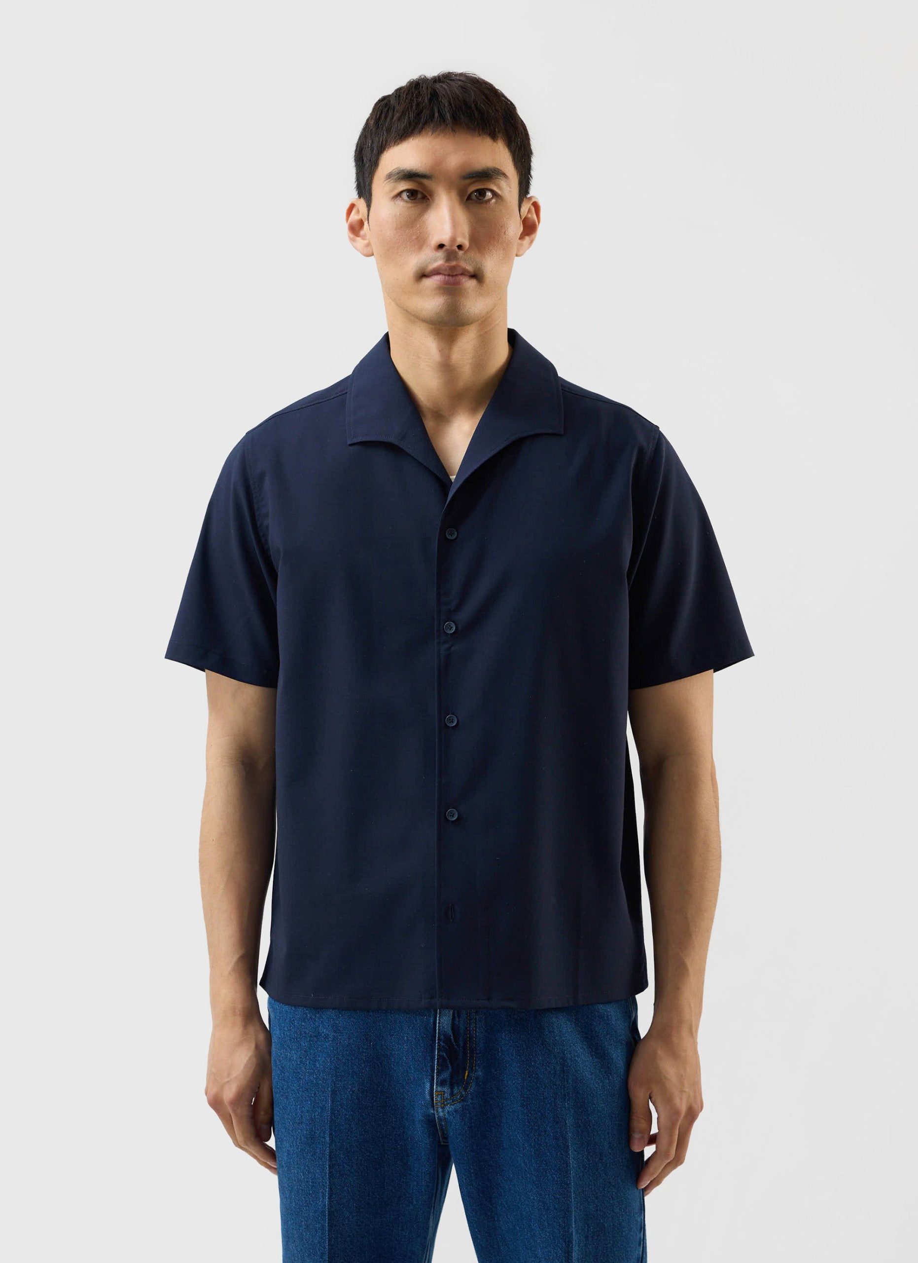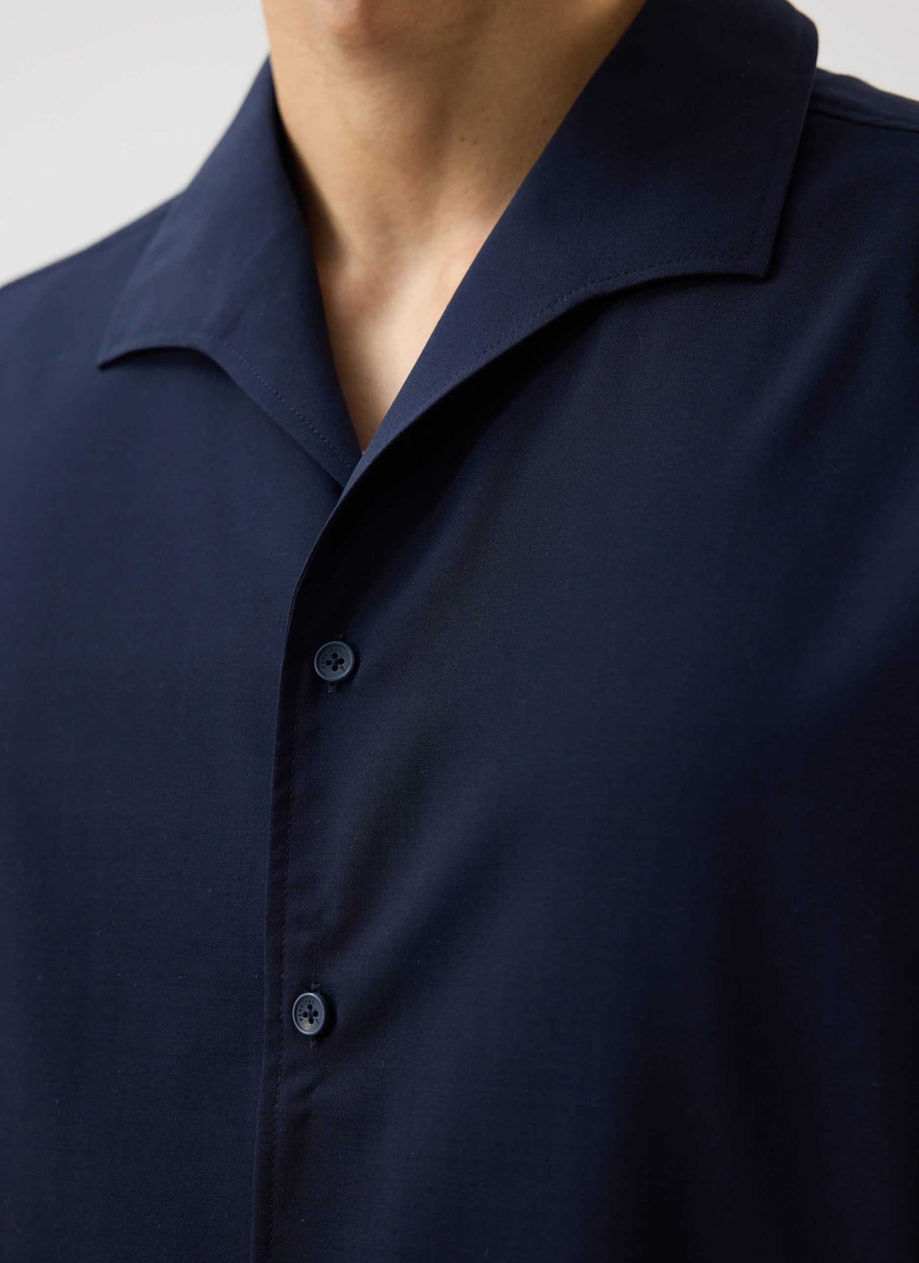 - Features: Men’s Cuban Collar Drape Shirt in Navy Blue, as part of the . Inspired by classic American workwear, this relaxed fit short sleeve shirt is cut from a lightweight wool blend for an effortless drape and breathable wear. Featuring custom Percival buttons and modern take on the cuban collar, a timeless piece that will amplify your summer style.