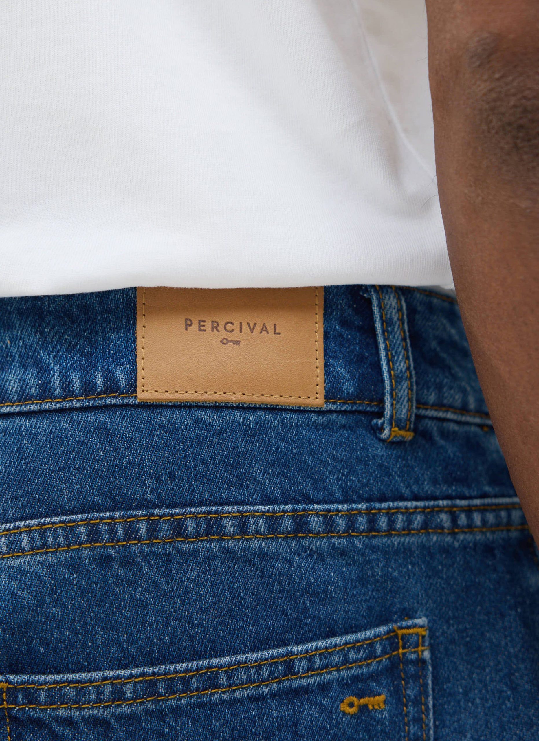 Percival denim is sourced from certified producers. Made from organic cotton, grown without the use of synthetic pesticides and regenerative cotton, which preserves soil health and biodiversity. The denim mill recycles treated water and also collects and reuse pre and post consumer yarns in production.