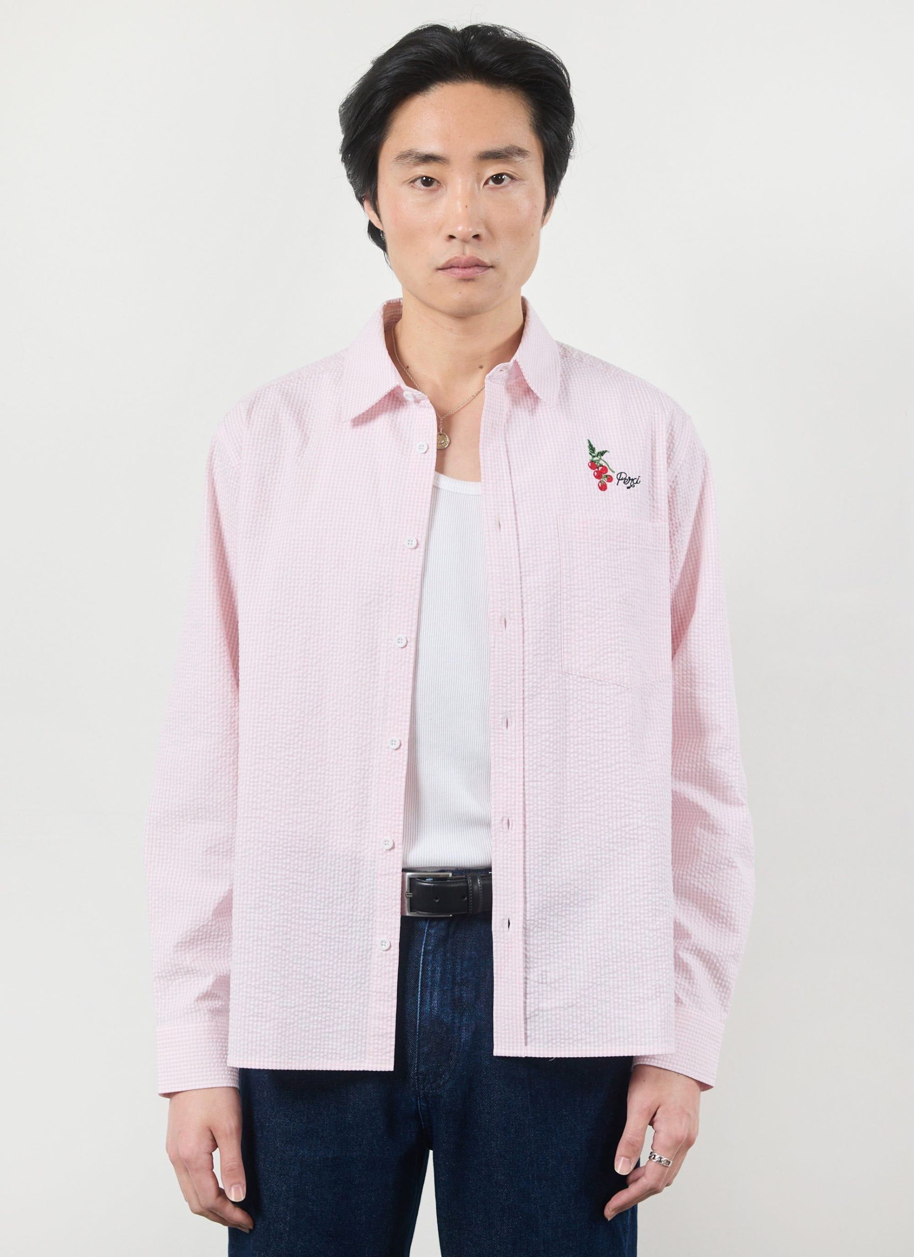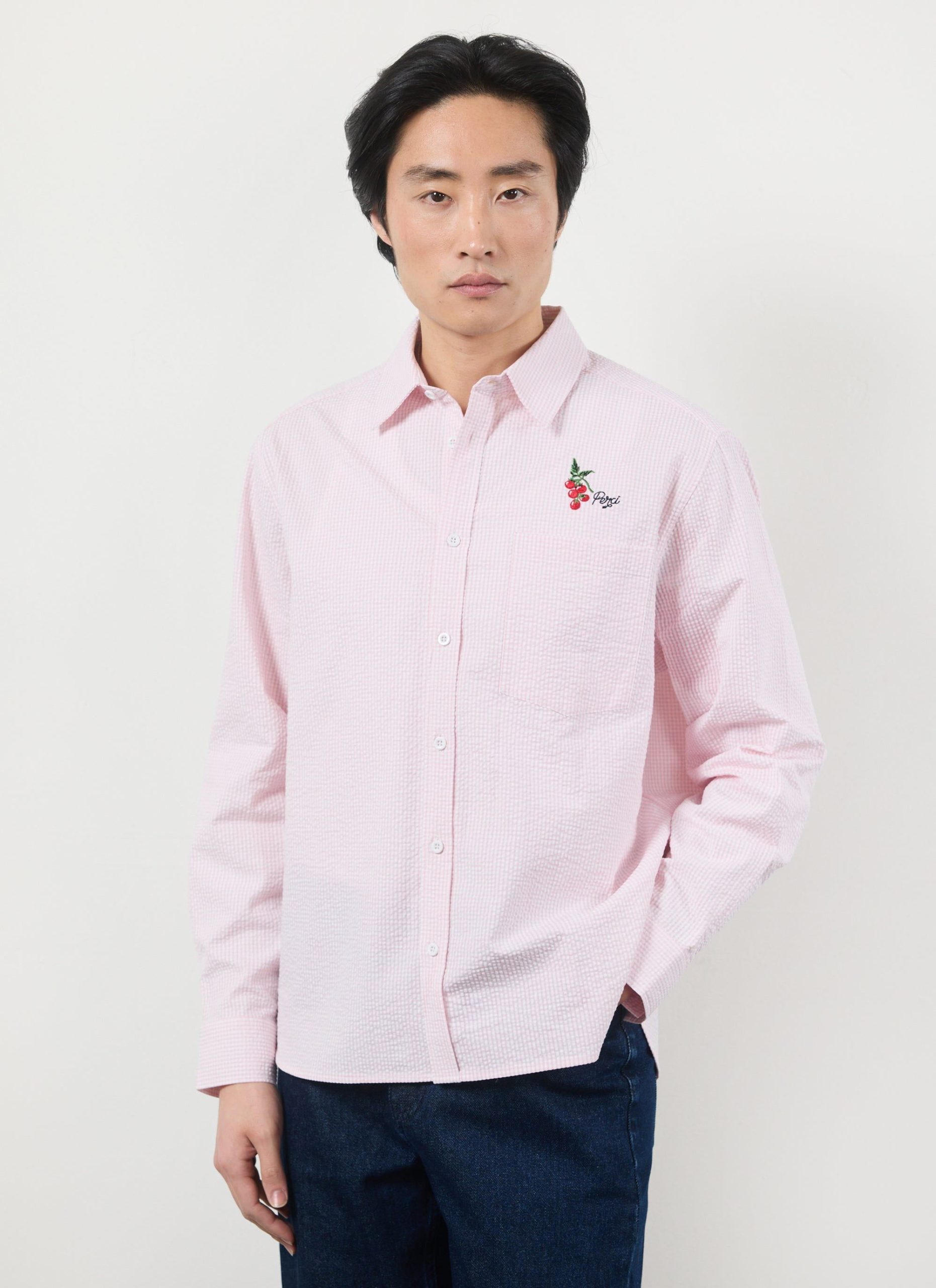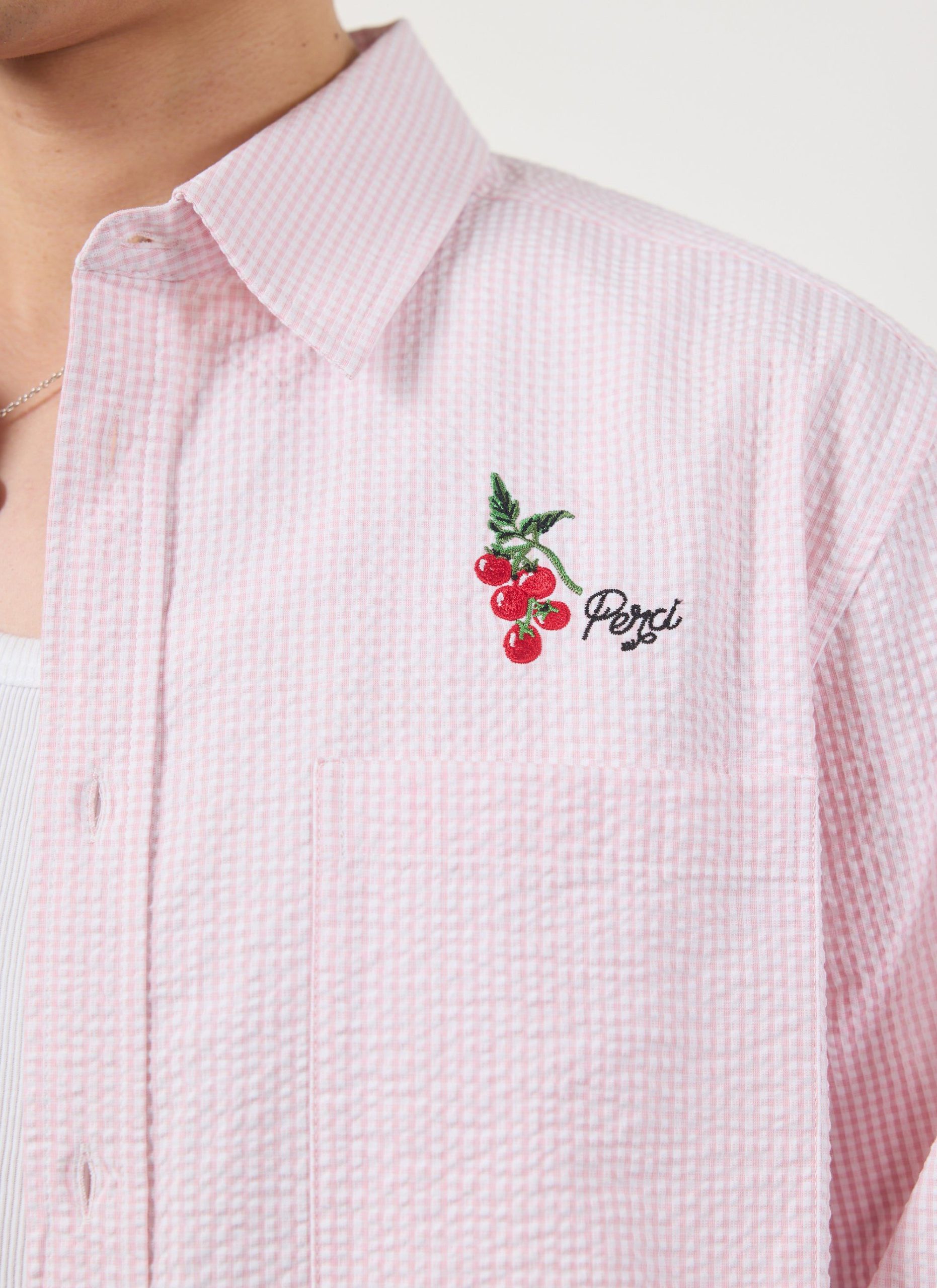 Sardinia oversized long sleeve shirt, fetching pink seersucker. Pink is for everyone and it can be for you this summer, for yes, summer is coming, well done, we will make it. Celebrating holidays to the sun, Sardinia and Sardinian tomatoes, full of tradition, excellence. Full flavour, Percival Spring / Summer 2025.
