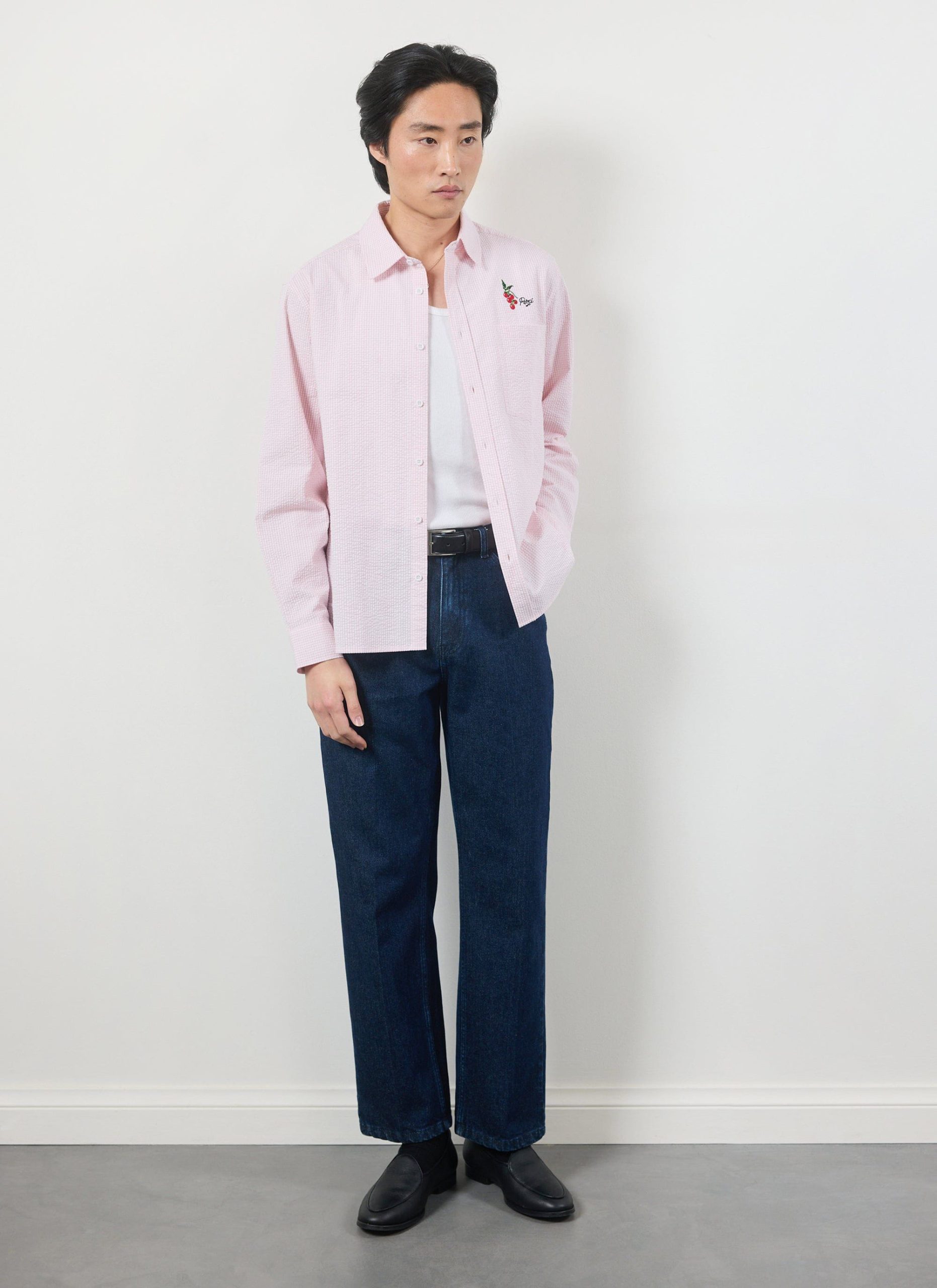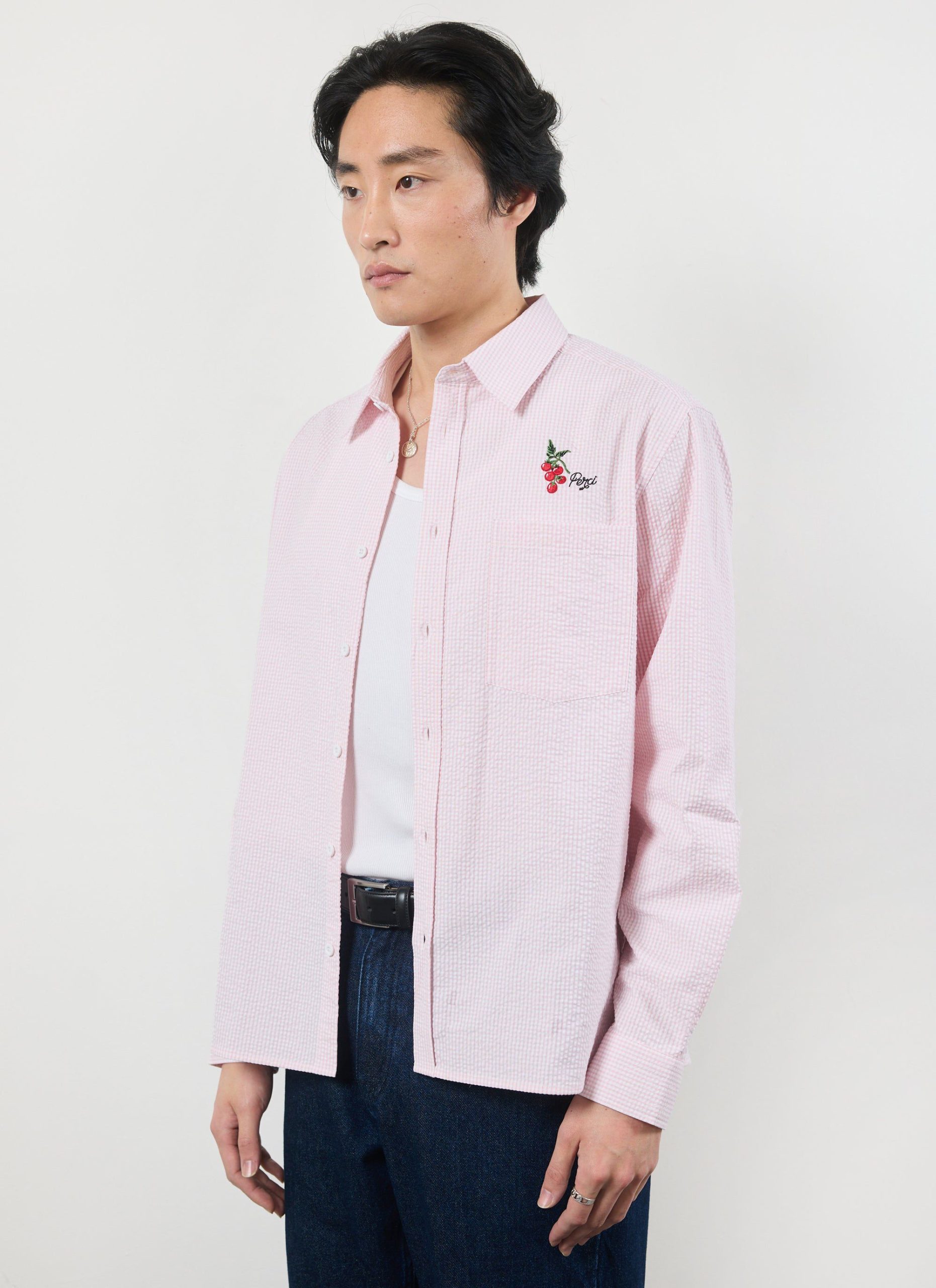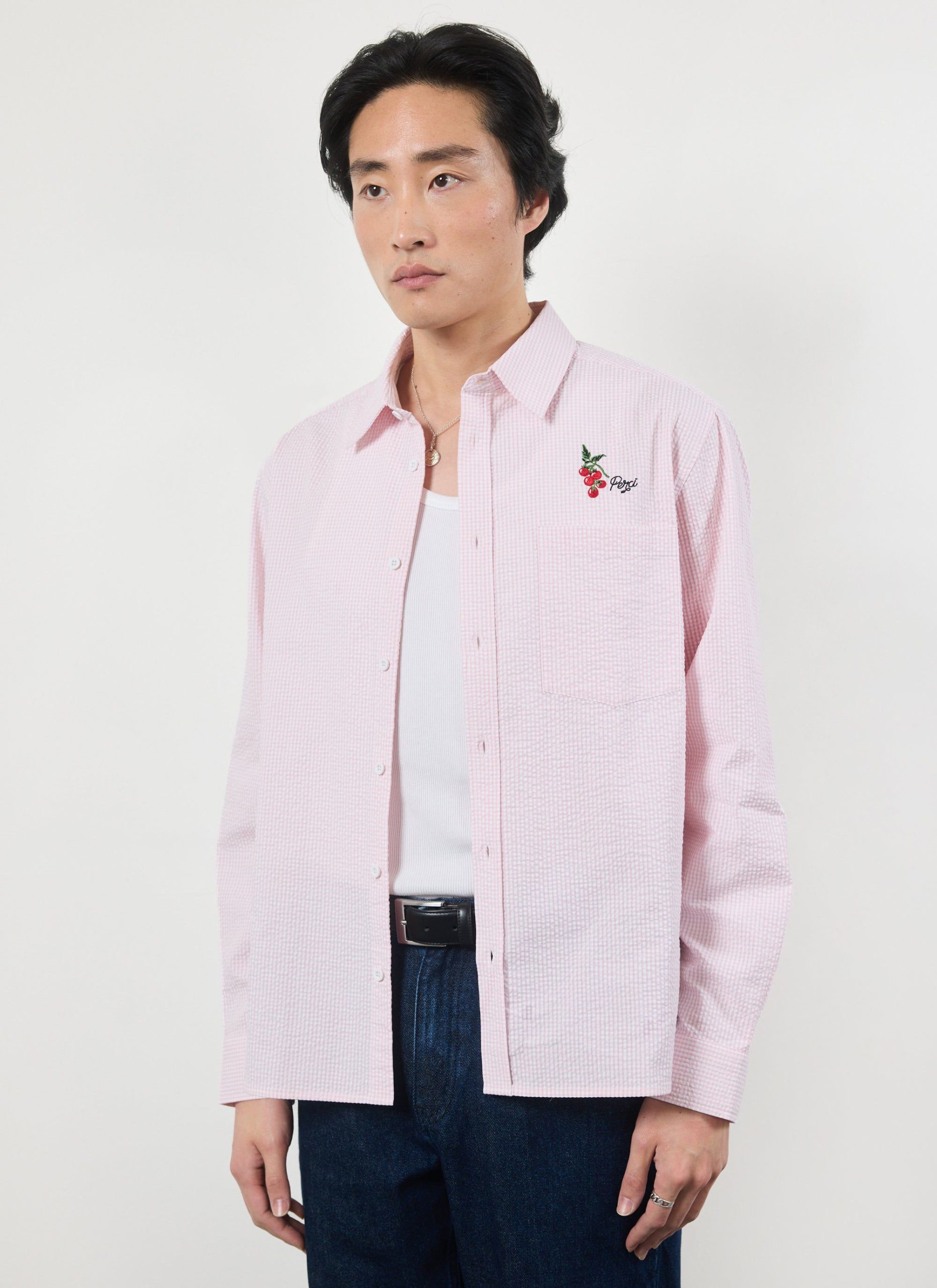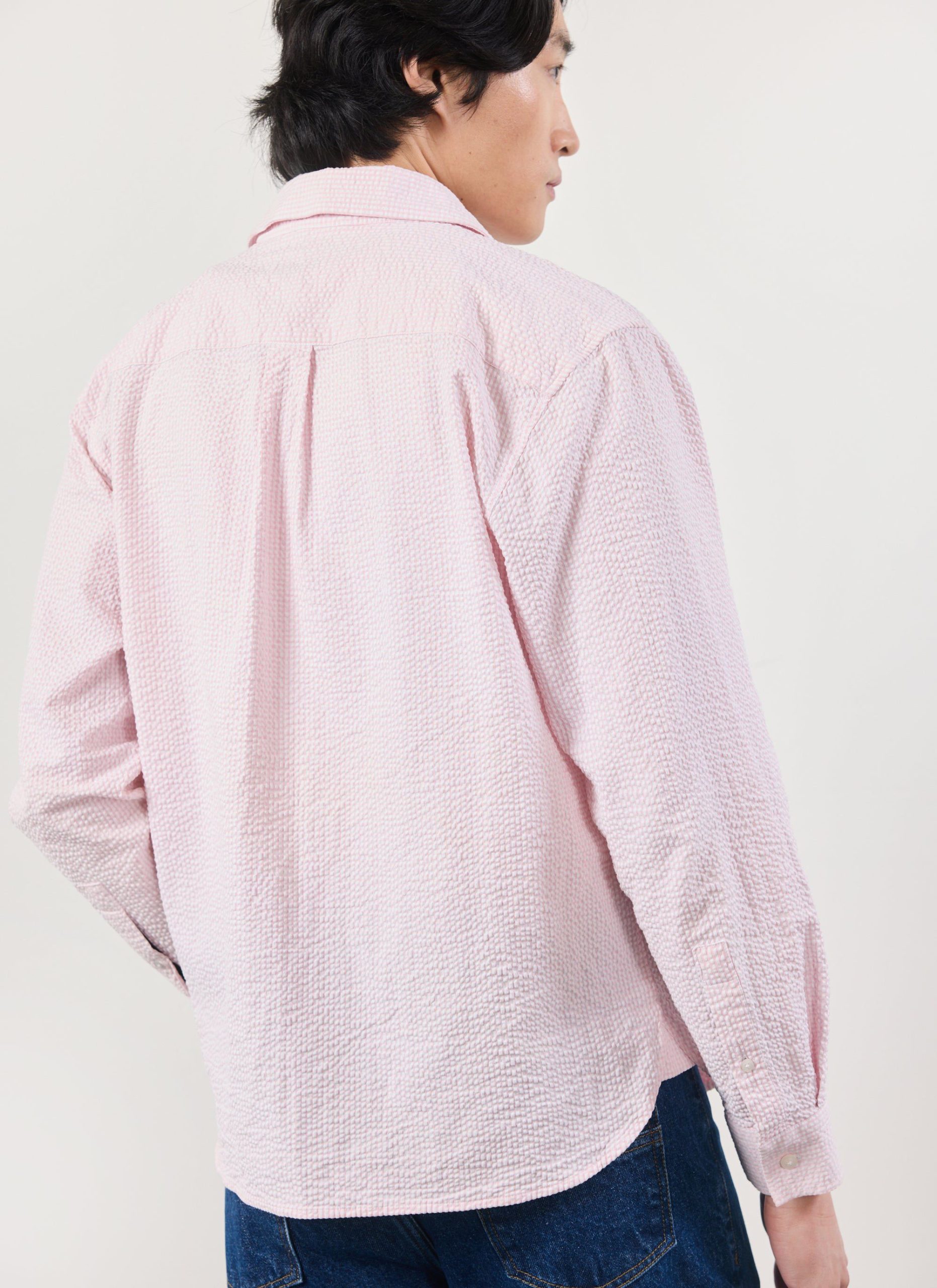 Sardinia oversized long sleeve shirt, fetching pink seersucker. Pink is for everyone and it can be for you this summer, for yes, summer is coming, well done, we will make it. Celebrating holidays to the sun, Sardinia and Sardinian tomatoes, full of tradition, excellence. Full flavour, Percival Spring / Summer 2025.