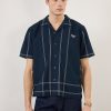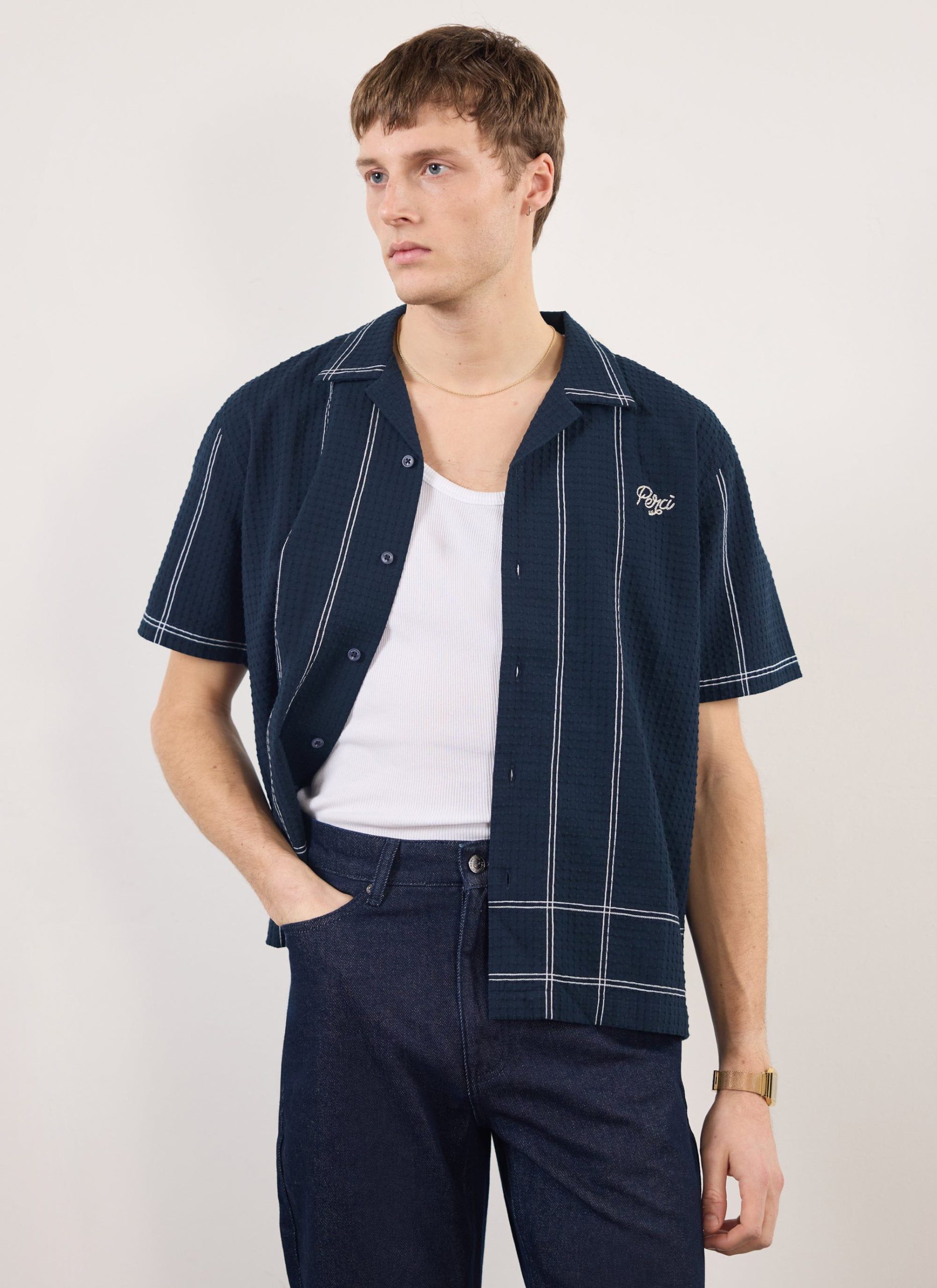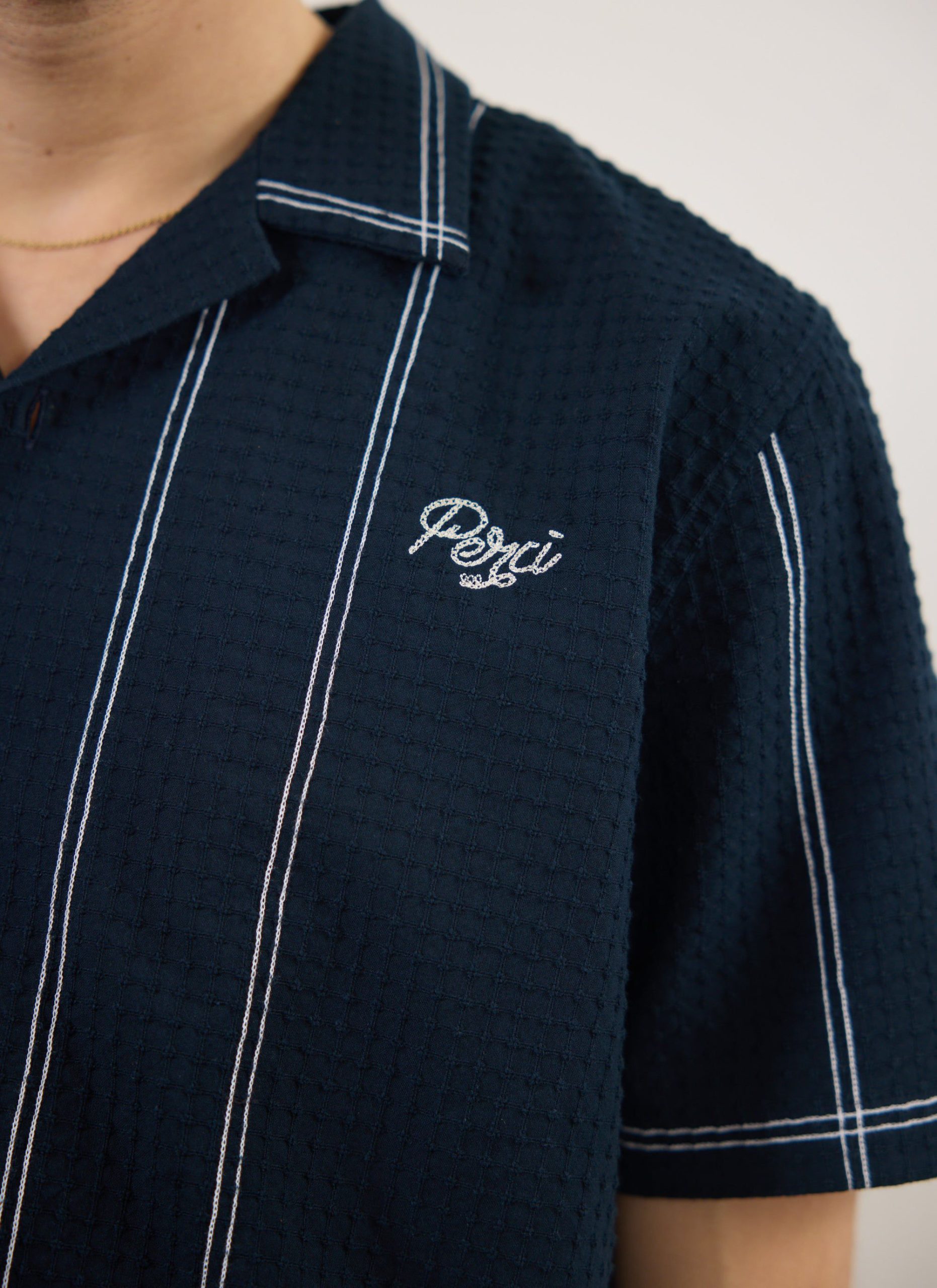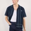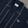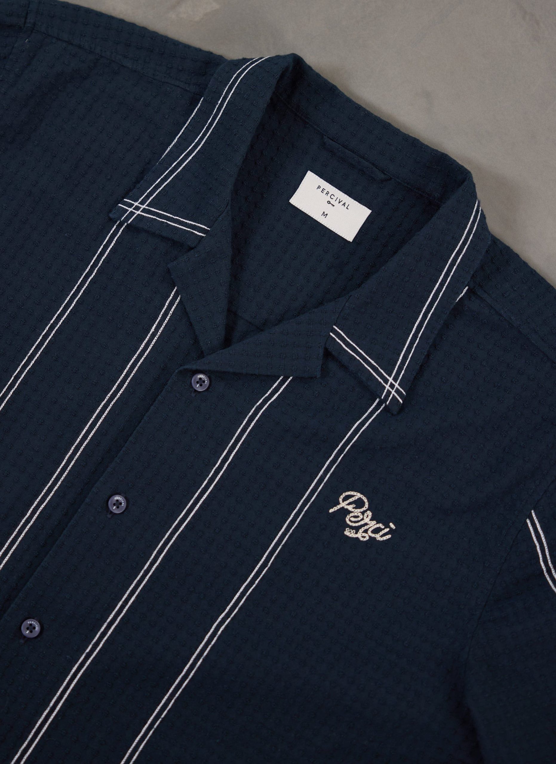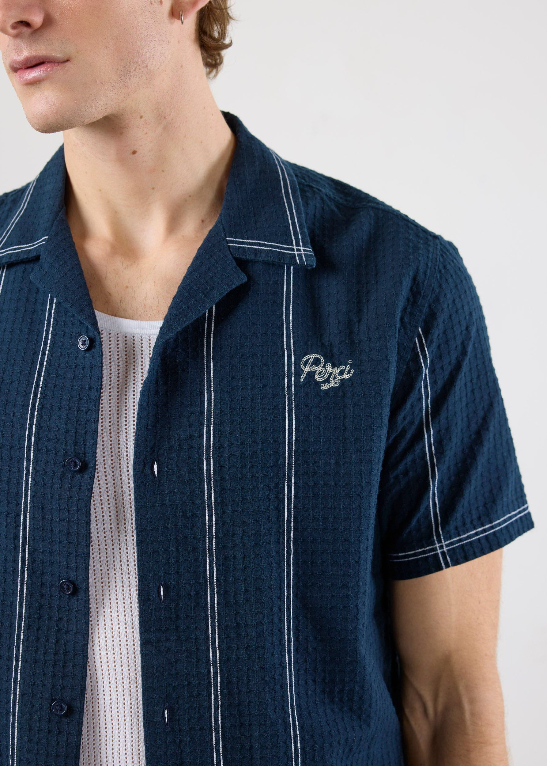 - Features: Men’s Embroidered Shirt made from 100% Cotton for a textured seersucker like finish. This navy button down shirt includes intricate embroidery details and a striped design across the shirt as well as a cuban collar. Perfect for layering and formal events, the Sicily Cuban Shirt is a must have Shirt for all men’s wardrobe.
