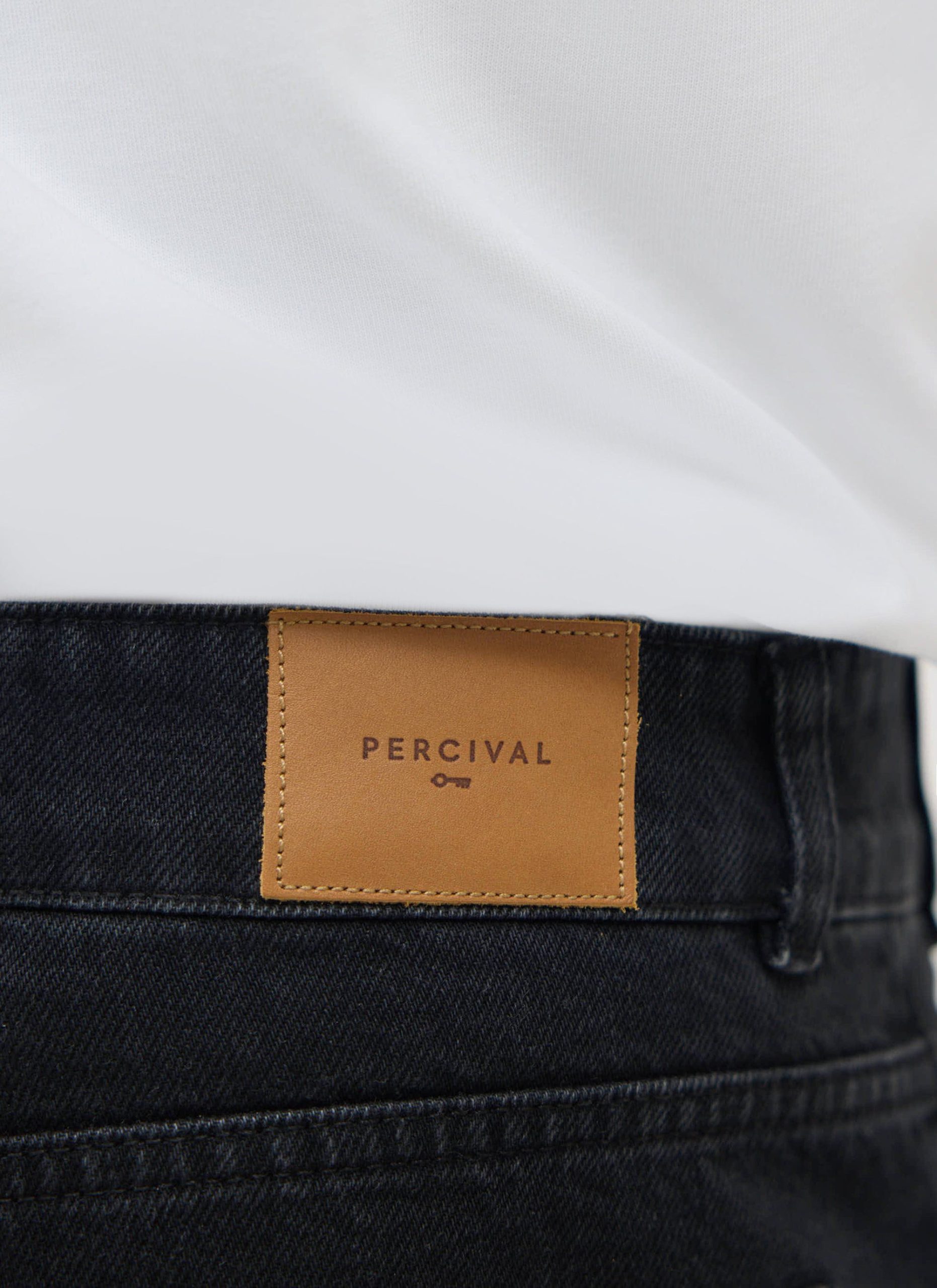 - Features: Men’s black jeans made from a heavyweight 14oz denim and constructed of 100% BCI Cotton. Featuring Percival branded gunmetal shanks and rivets and a branded leather tan back waistband patch, these straight leg jeans are an easy-to-wear wardrobe staple for Autumn and Winter.