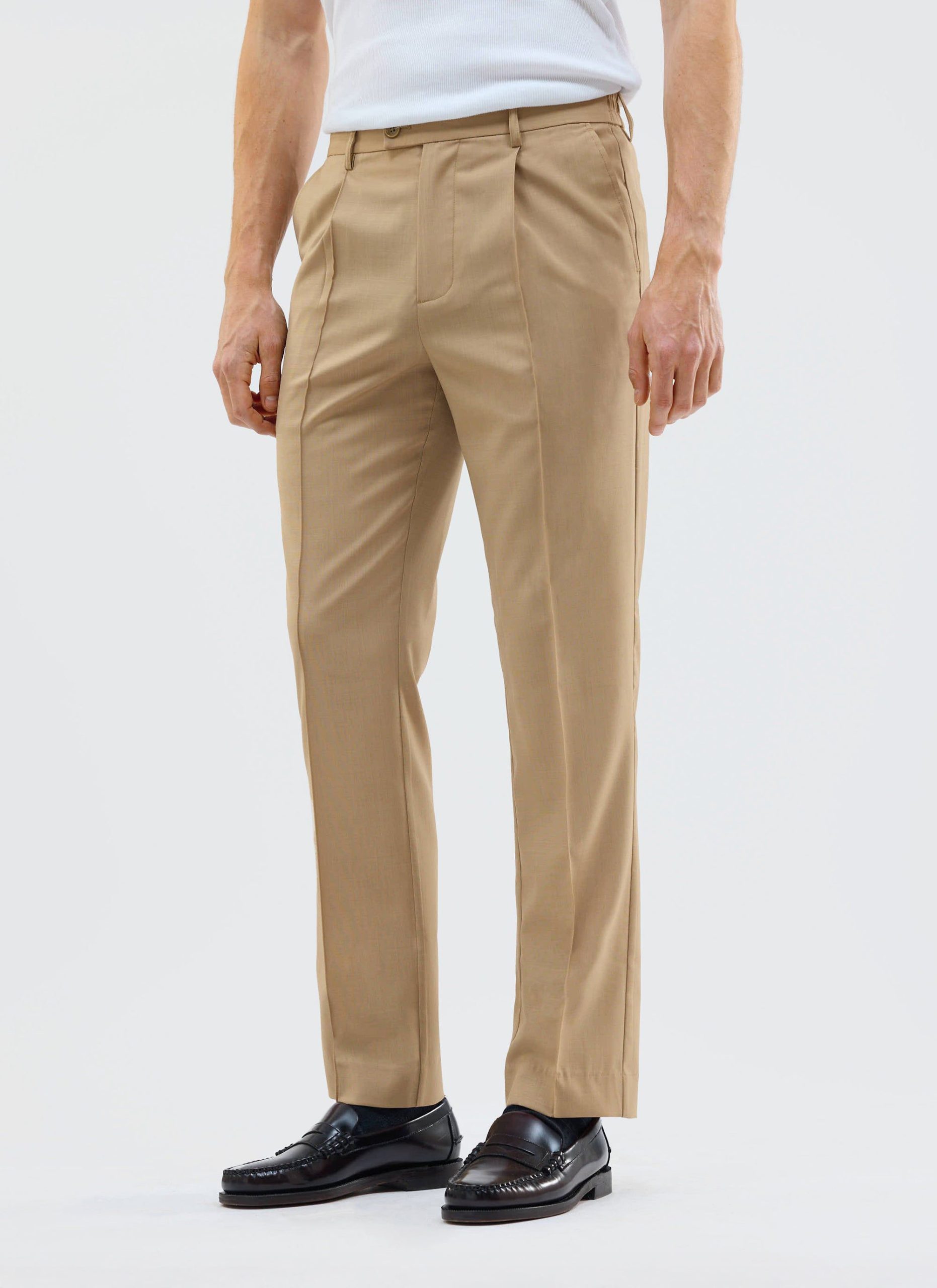 - Features: Men’s pleated tan trousers combine the polished look of smart tailoring with the comfort of joggers, thanks to an elasticated waist. Designed with four pockets for practicality and buckles for belt styling, these tailored trousers offer a roomy fit through the thigh and taper neatly toward the ankle. Perfect for summer and wearable for any occasion, they pair effortlessly with any shoe to keep your style sharp and versatile.