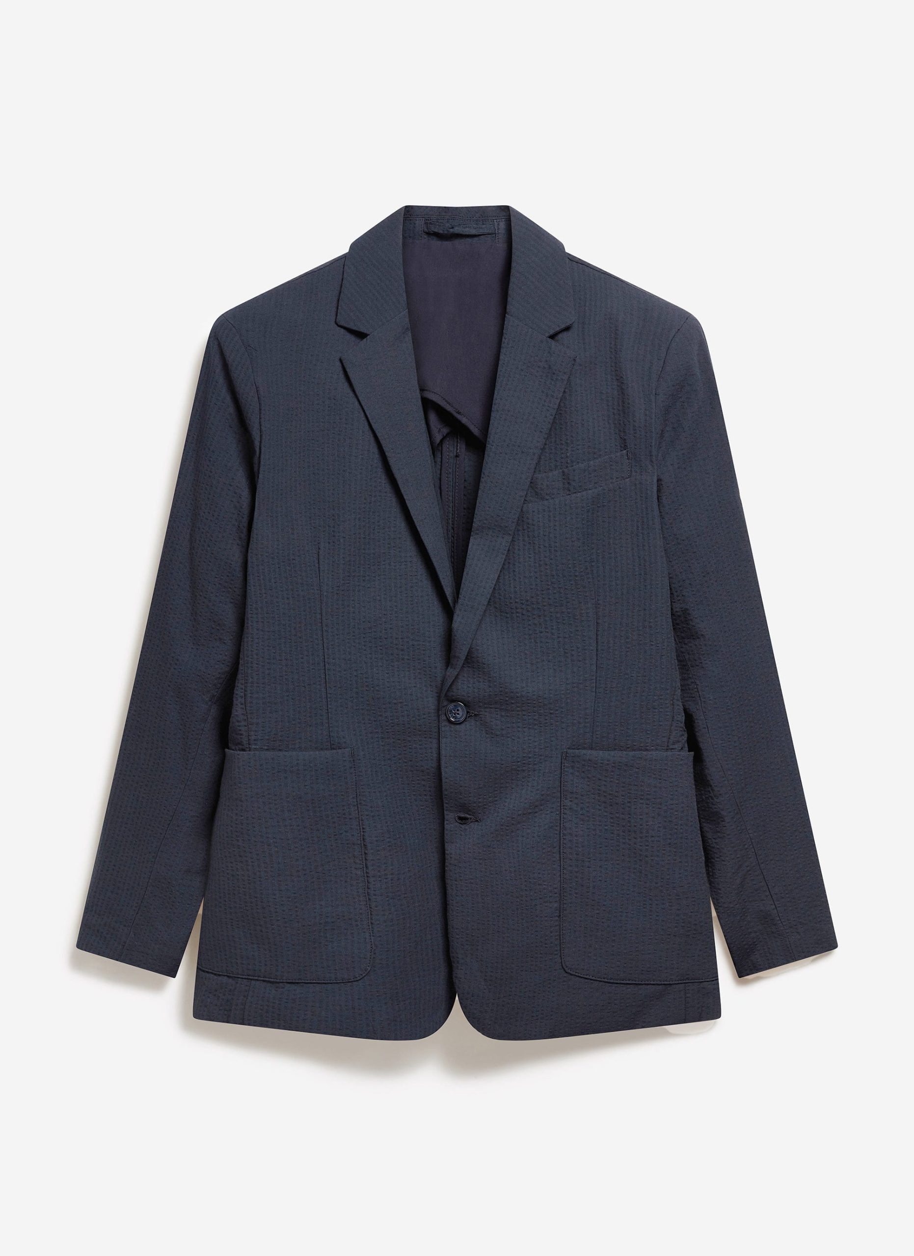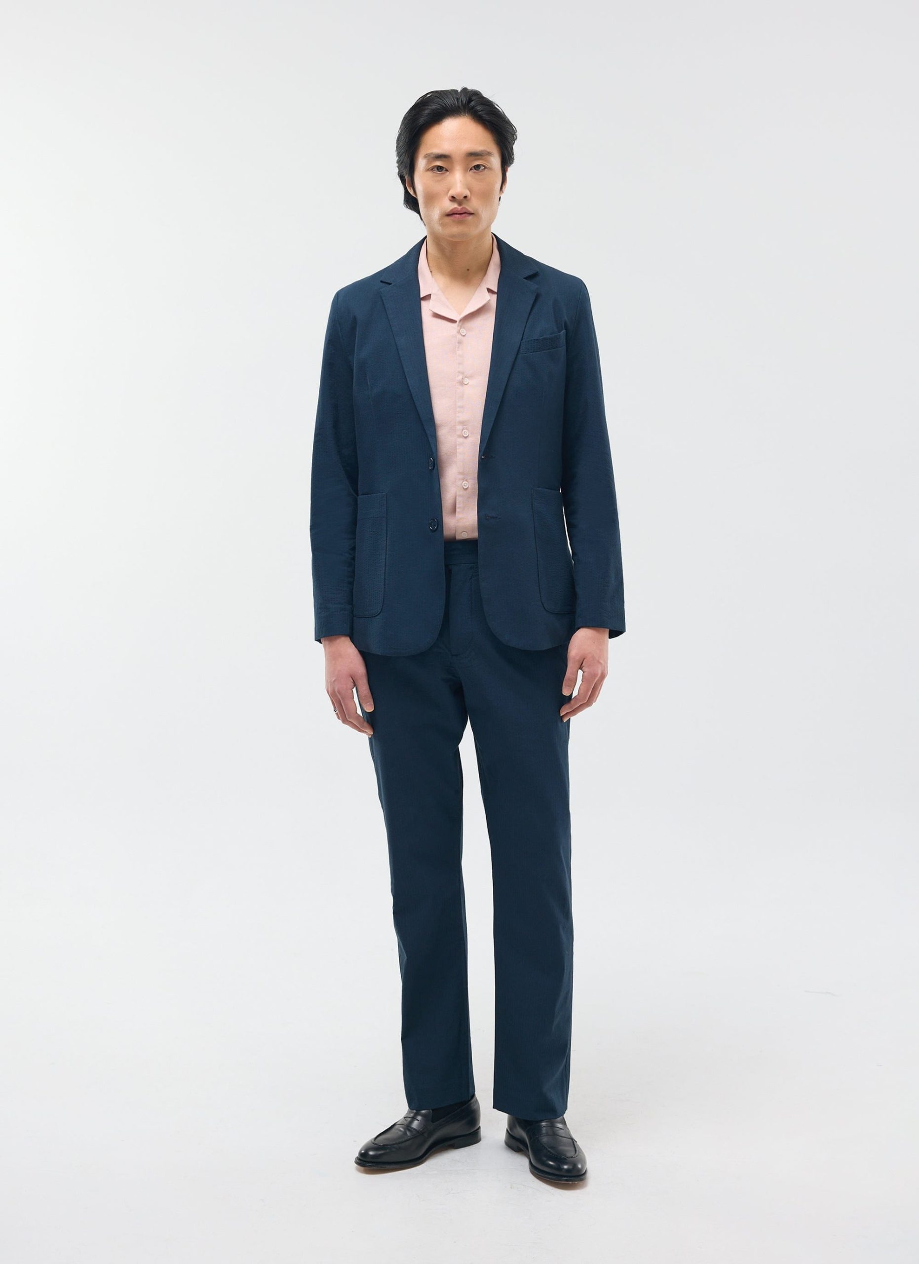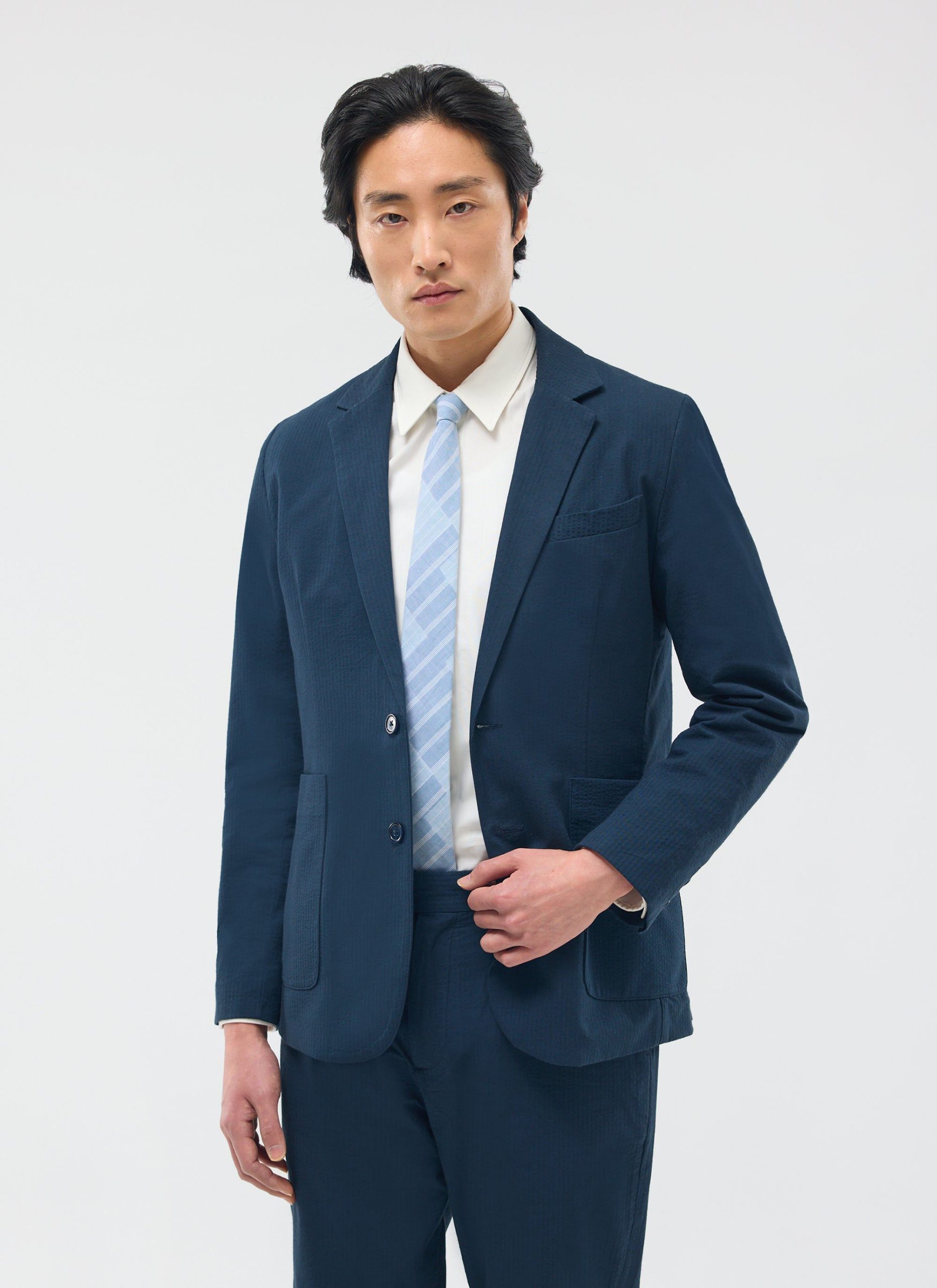 - Features: Tailored blazer for men made from a , with updated body and sleeve widths for comfort. With thin shoulder pads for a structured shoulder shape, this seersucker suit jacket is ideal for weddings and smart dressing. Finished with button-fastening, side patched pockets, chest welt pocket, back vents and internal welt pockets, this navy suit jacket can be worn for all smart-dressing occasions.