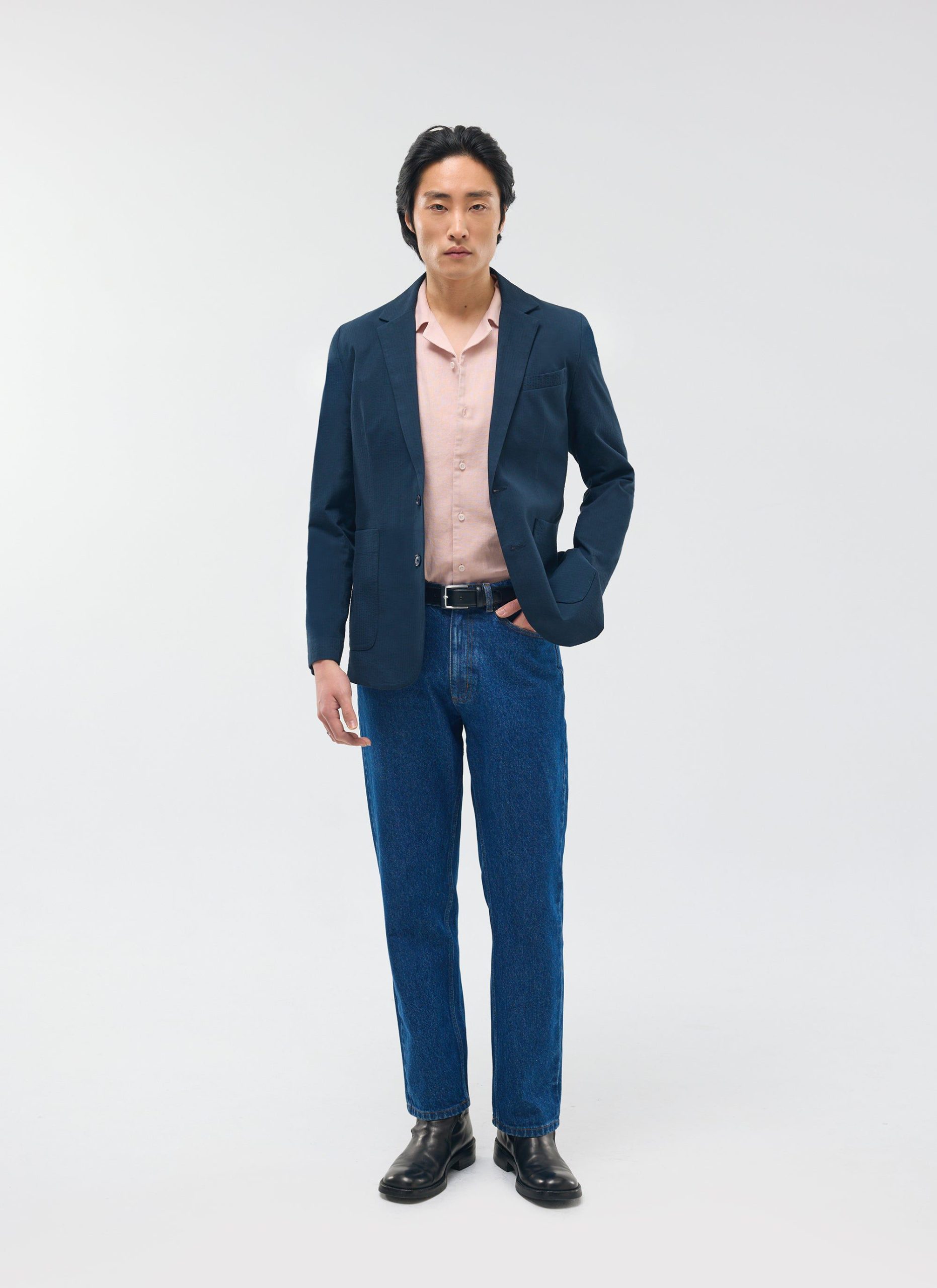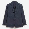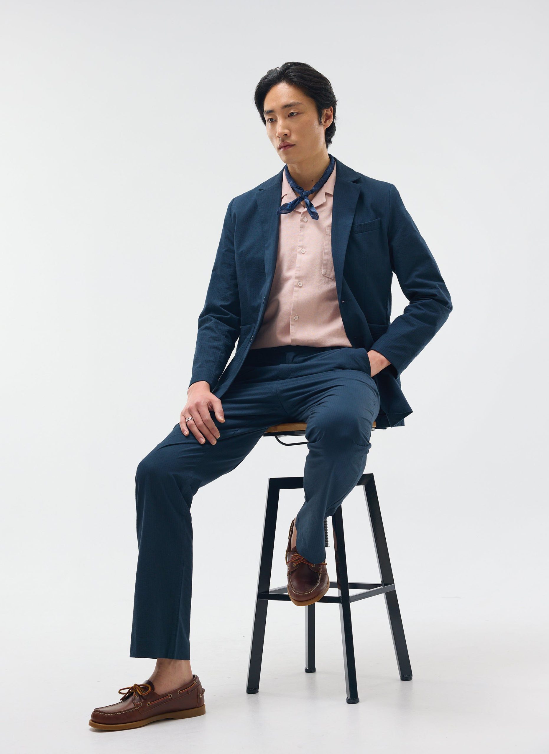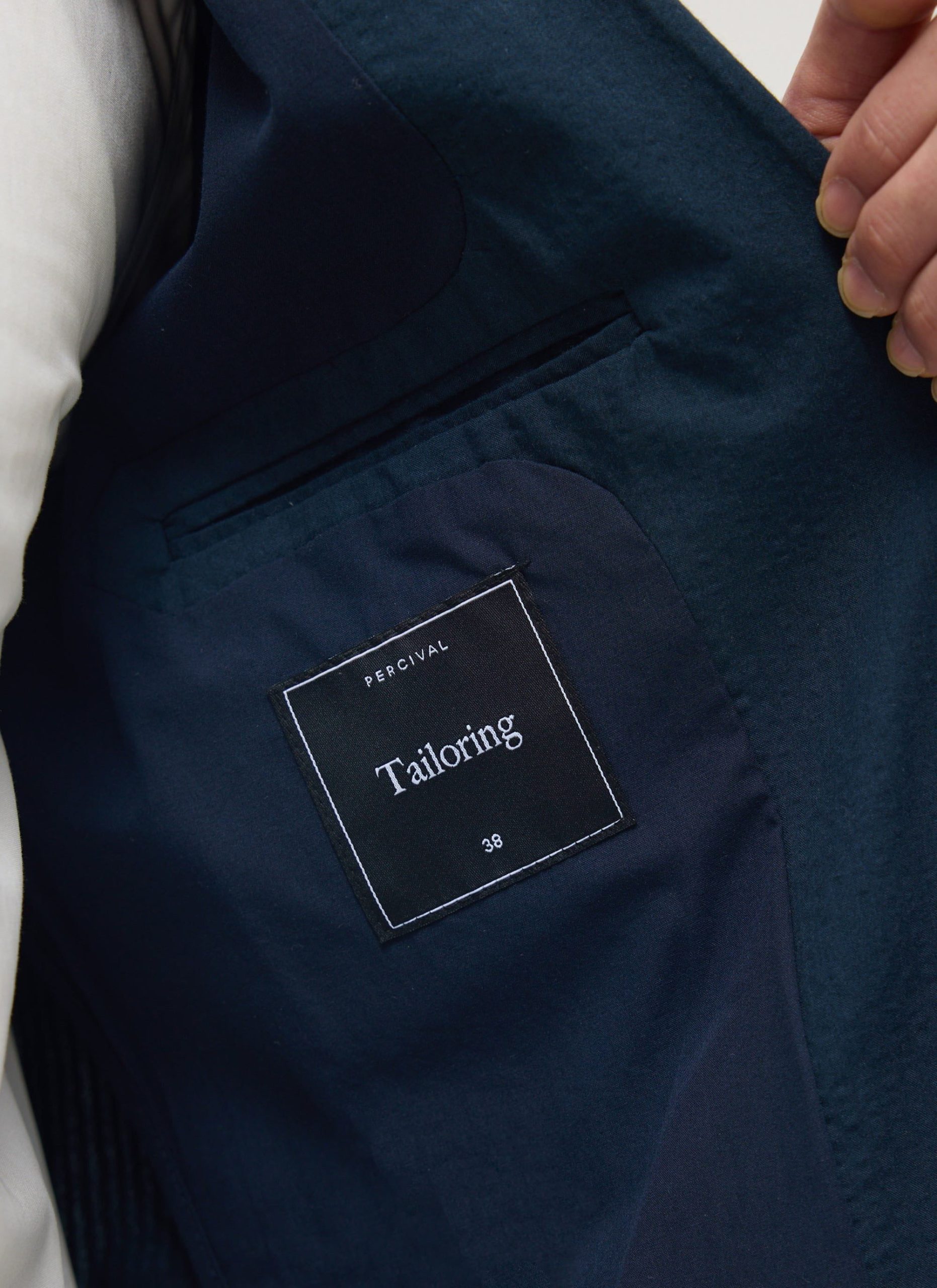 - Features: Tailored blazer for men made from a , with updated body and sleeve widths for comfort. With thin shoulder pads for a structured shoulder shape, this seersucker suit jacket is ideal for weddings and smart dressing. Finished with button-fastening, side patched pockets, chest welt pocket, back vents and internal welt pockets, this navy suit jacket can be worn for all smart-dressing occasions.