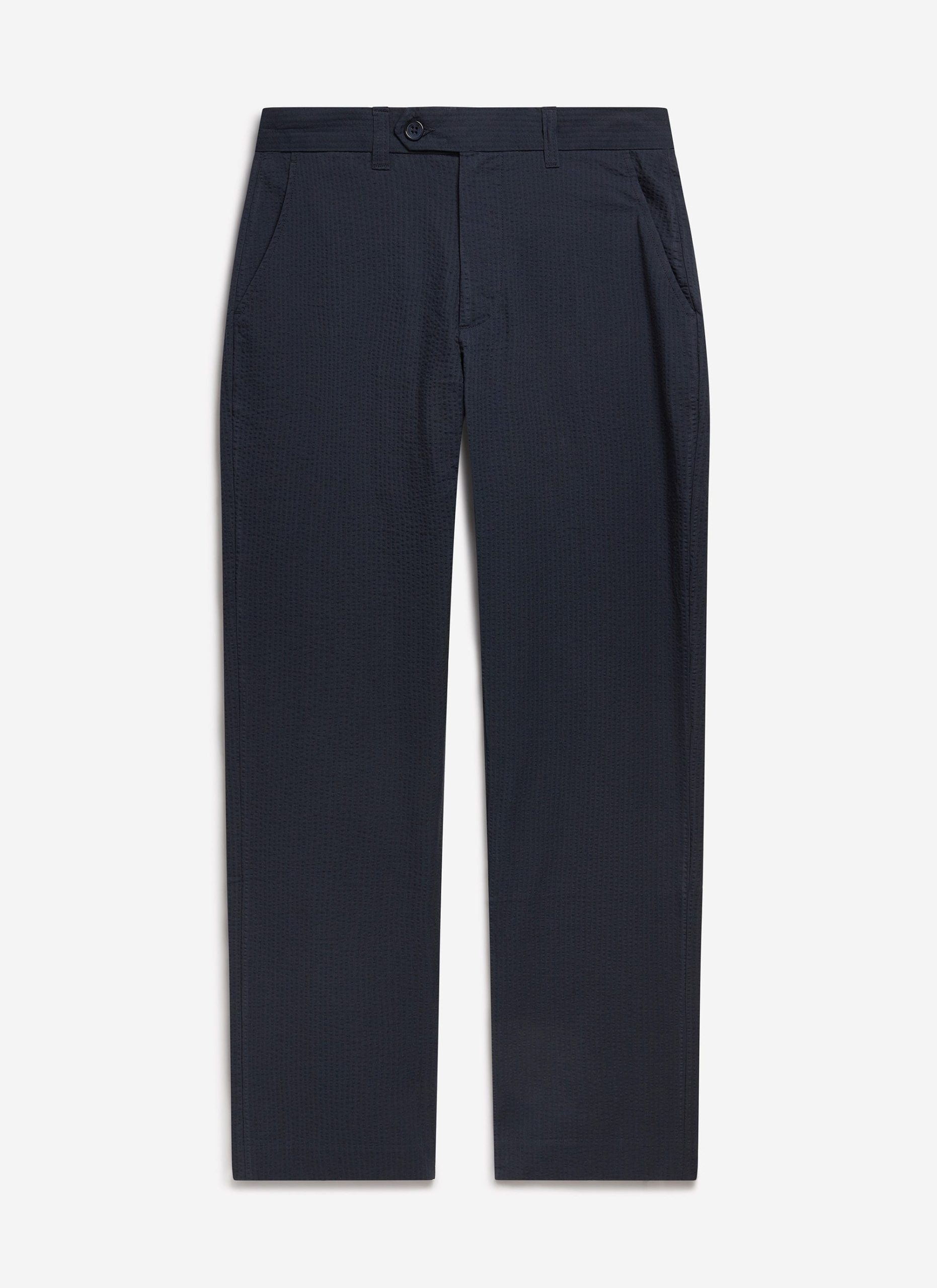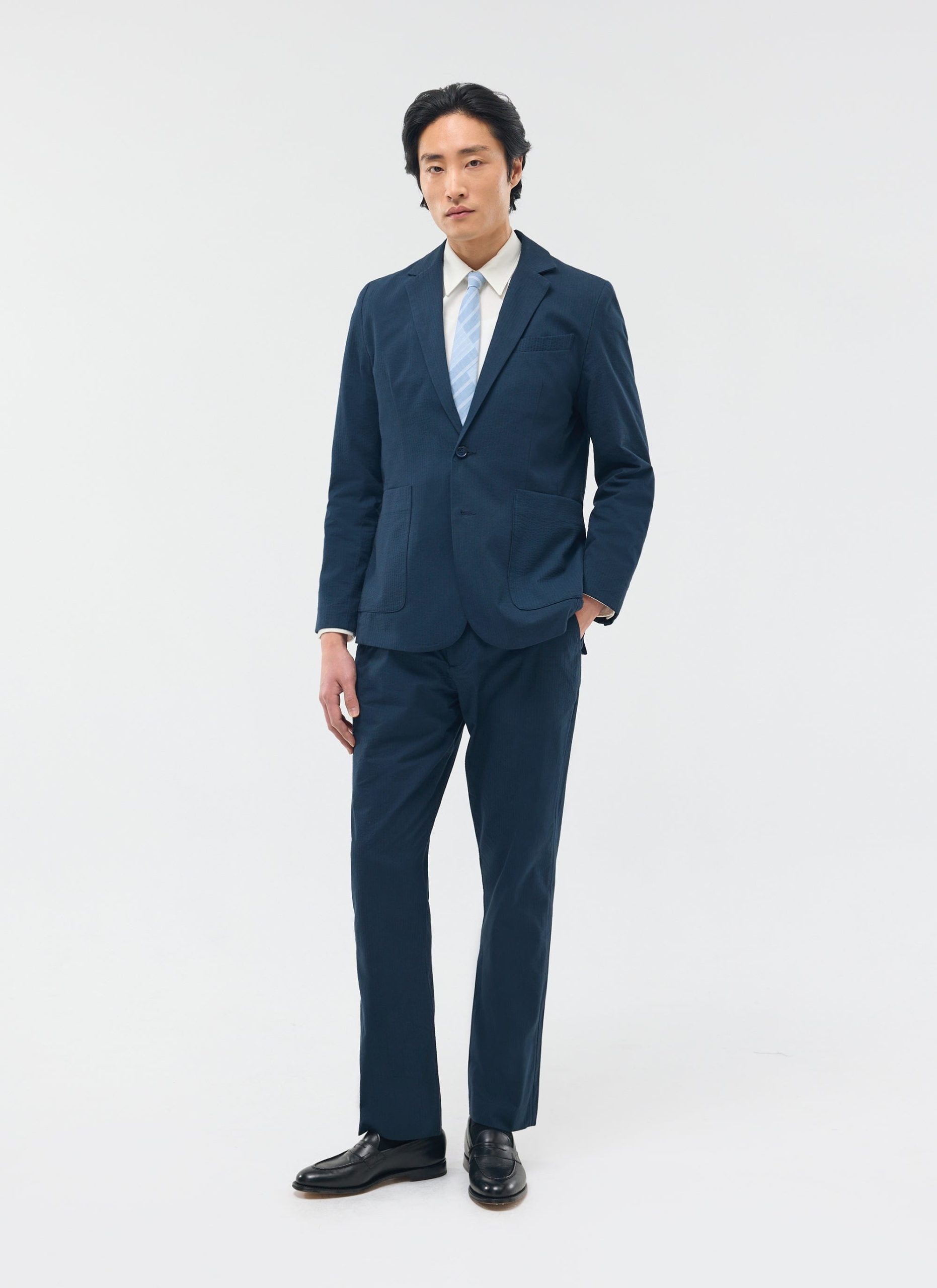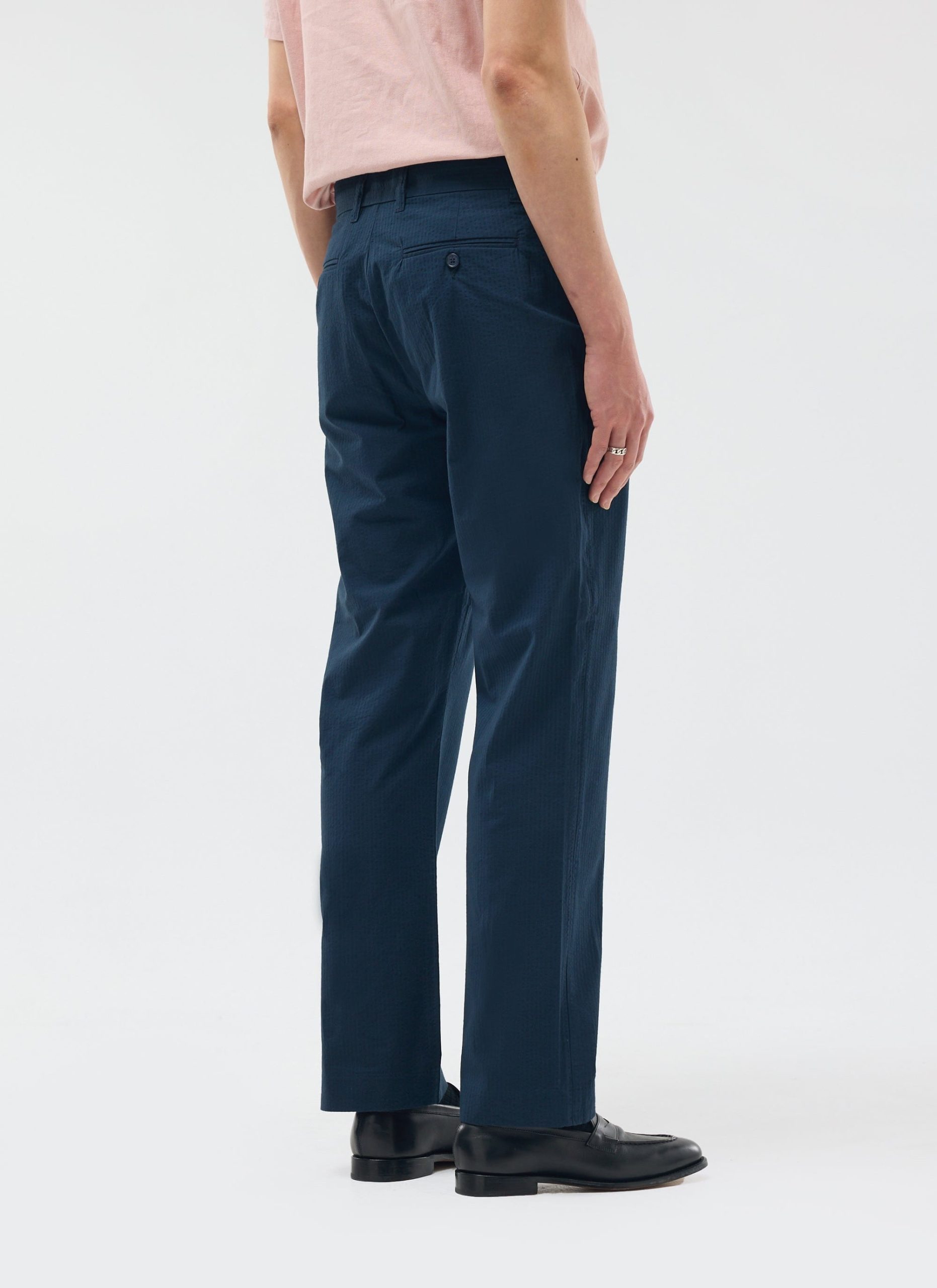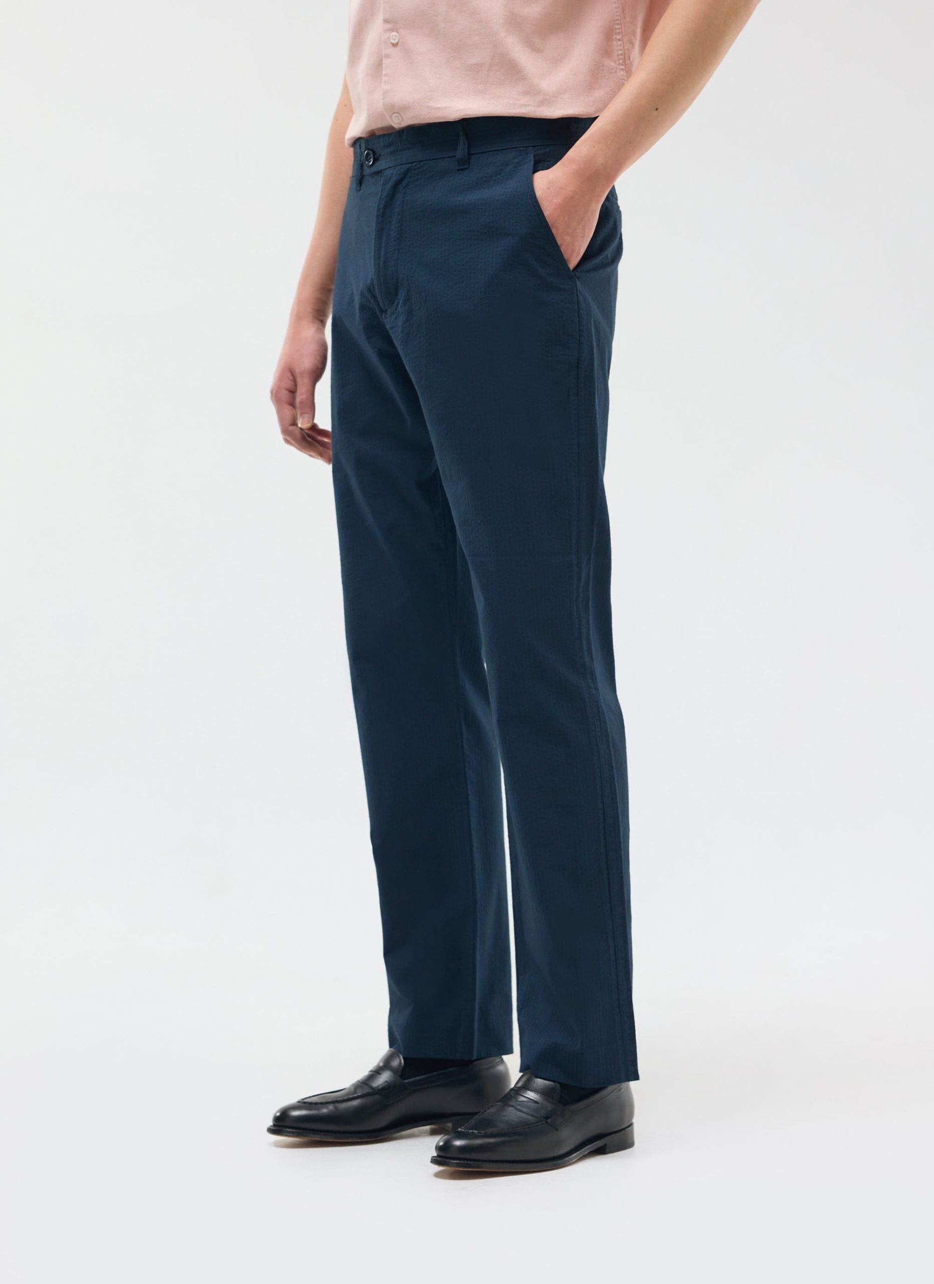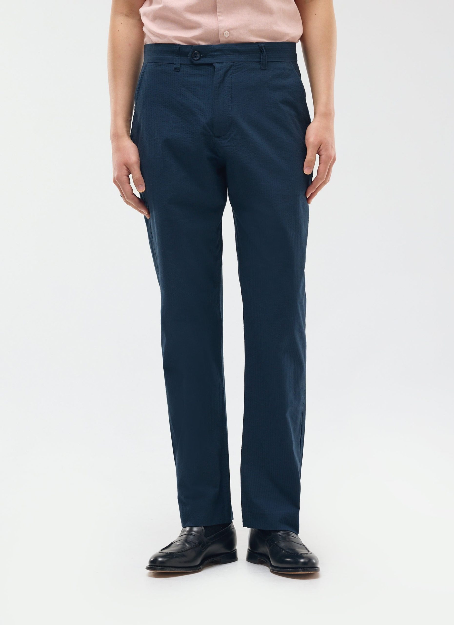 - Features: Men’s Tailored Trousers made from a in Navy Blue. A Navy Straight Leg Trouser with tailored details. The Seersucker Trousers features include a zip fly, back welt pockets, fixed waistband and belt loops, ideal for wearing with a belt. The smart casual trousers are finished with a 4.5cm invisible hem turn up depth which allows fleg length alteration for personal preference, making these suit trousers perfect for weddings and smart dressing.