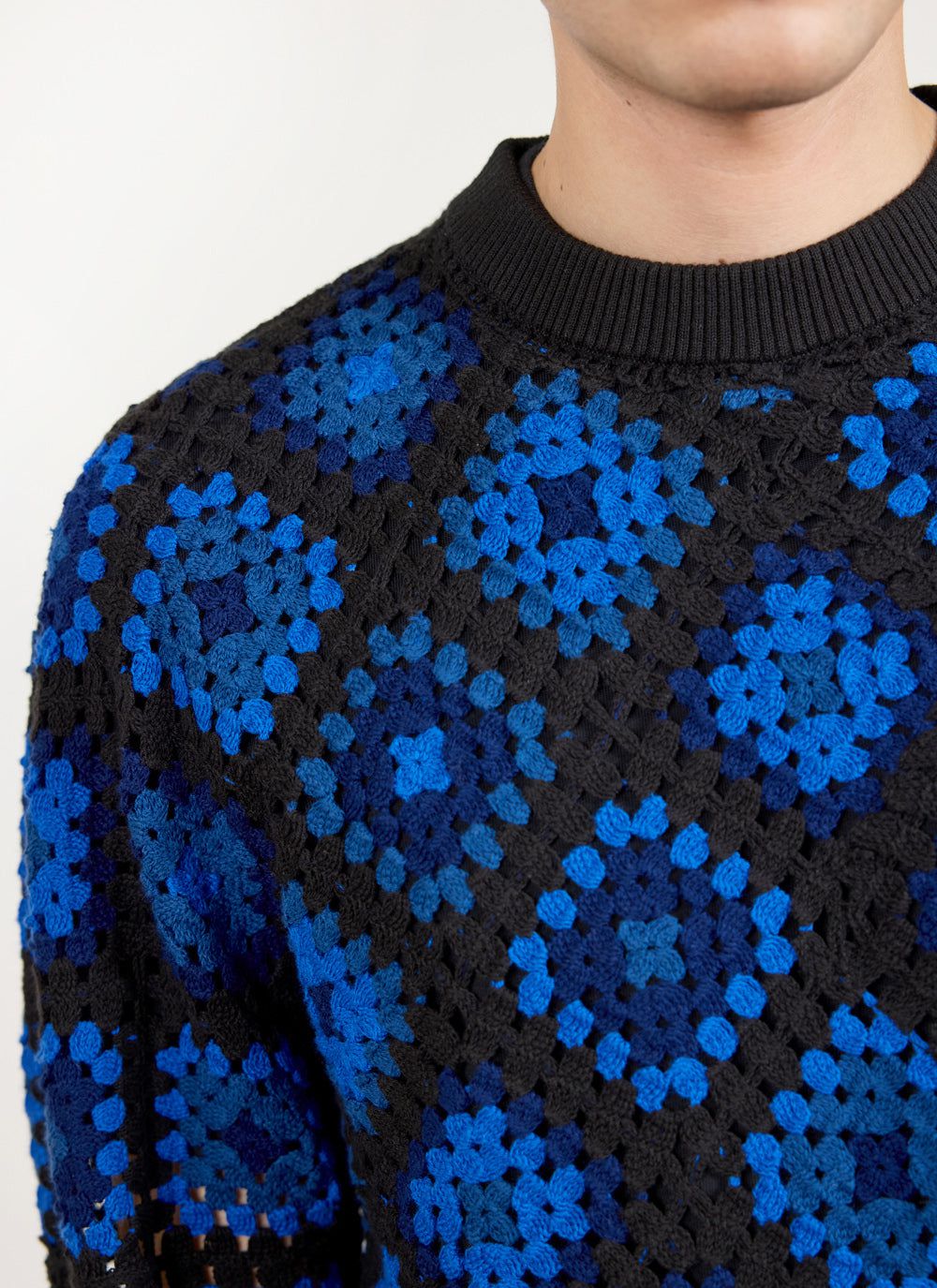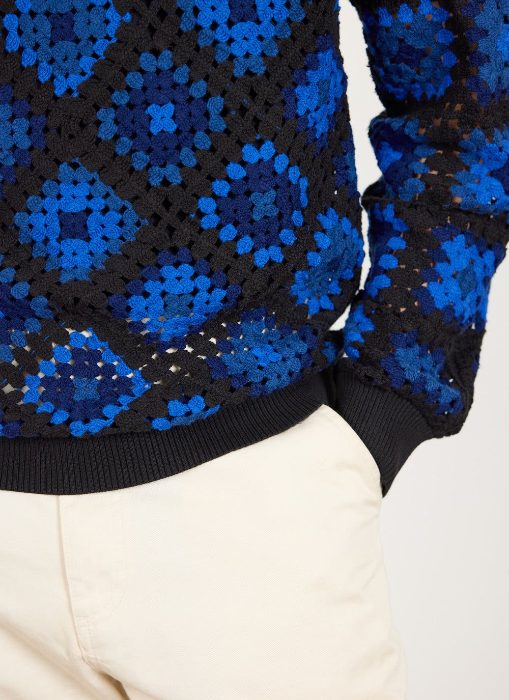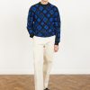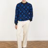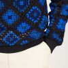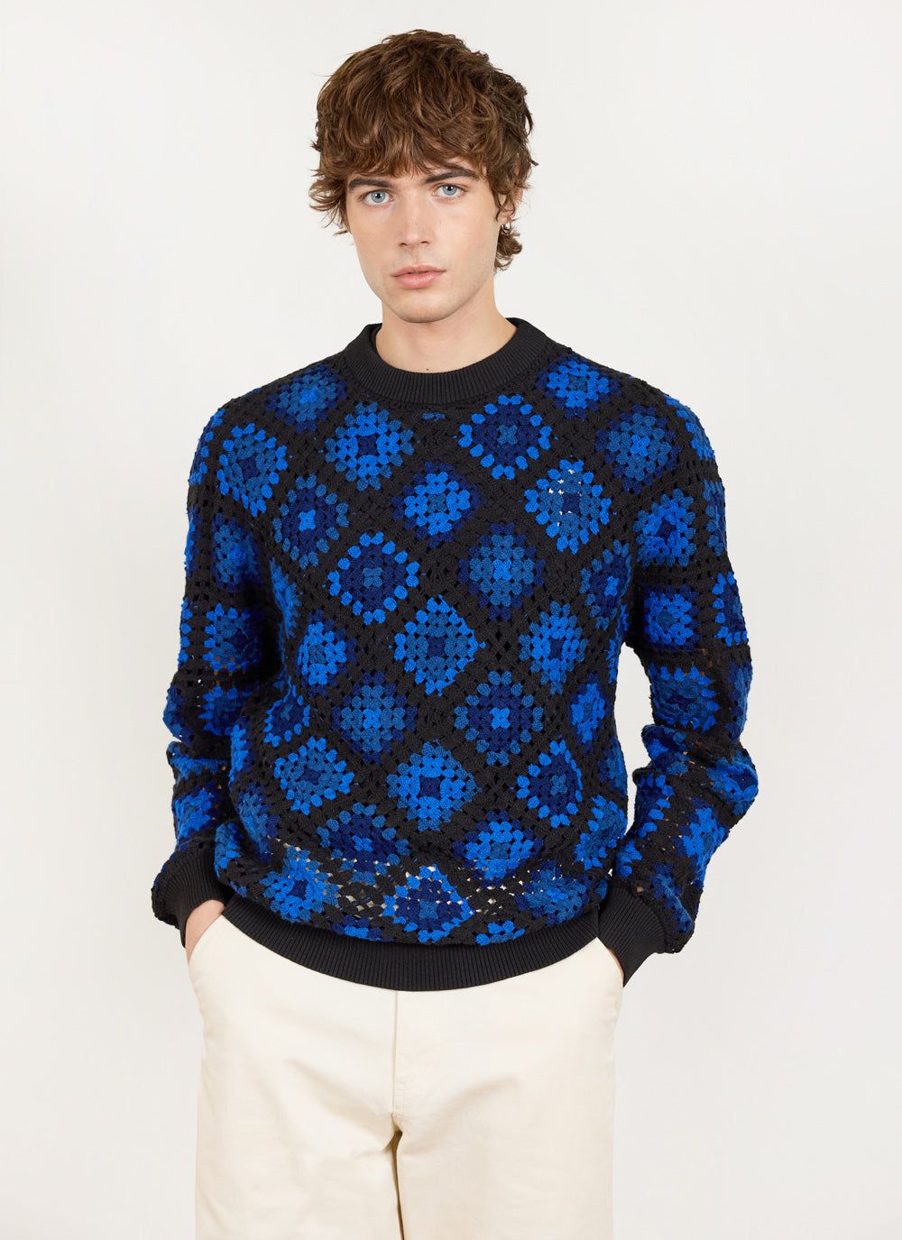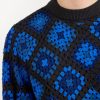 - Features: Men’s crew neck jumper made from 100% organic cotton. This blue jumper features a unique custom crochet design, perfect for making a bold style statement while staying comfortable in a regular fit. Ideal for layering in Autumn or as a standout piece in your wardrobe.