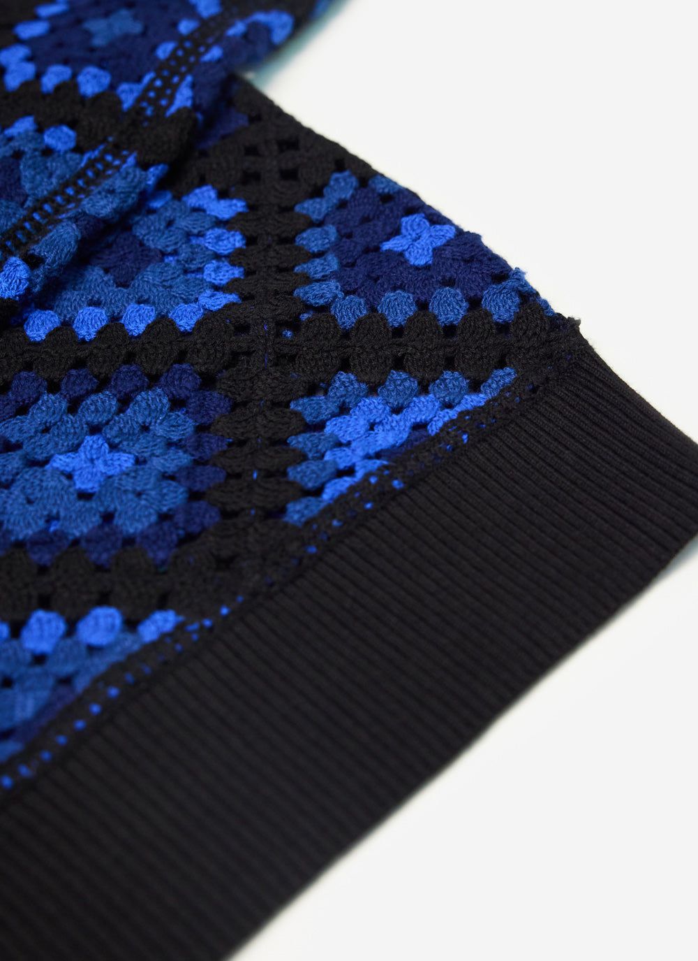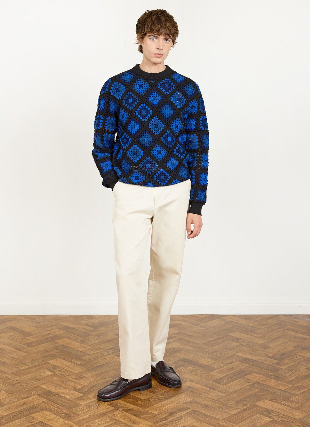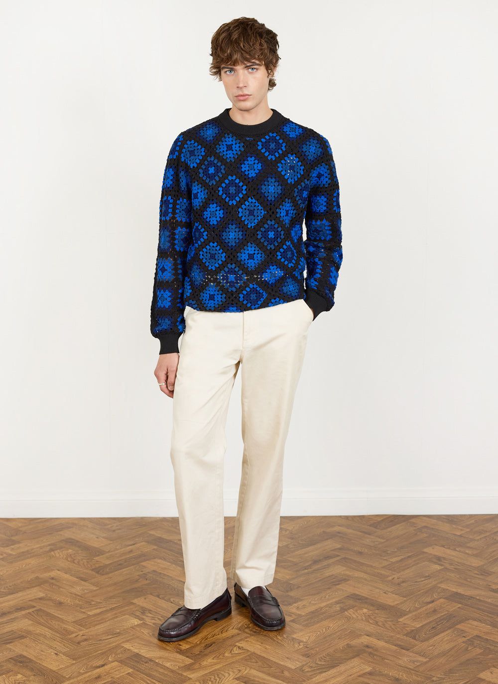 - Features: Men’s crew neck jumper made from 100% organic cotton. This blue jumper features a unique custom crochet design, perfect for making a bold style statement while staying comfortable in a regular fit. Ideal for layering in Autumn or as a standout piece in your wardrobe.